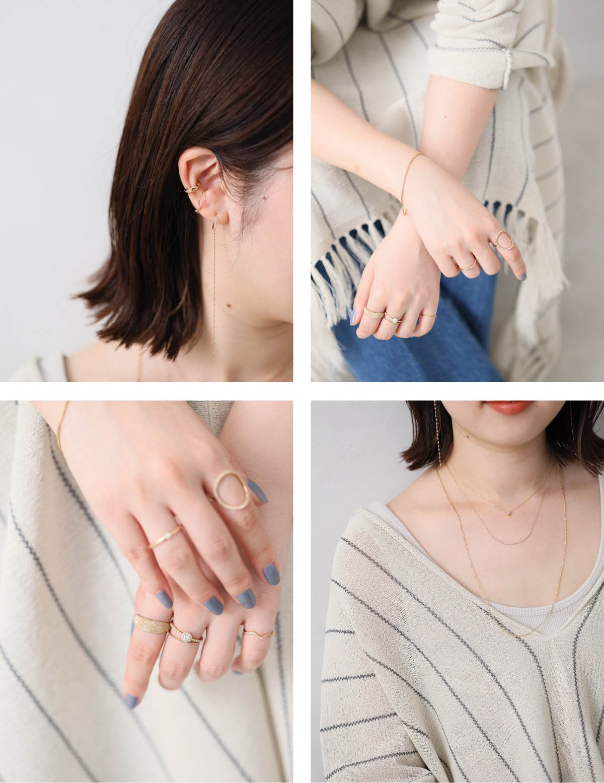- ダイヤモンドをメインにしつつ、顔まわりは華奢なゴールドアイテムで抜け感を出して。華奢なシルエットのダイヤモンドのリングはたくさん重ねづけしてもまとまって見えます。さりげなくボリュームのあるリングを合わせるのもポイント。