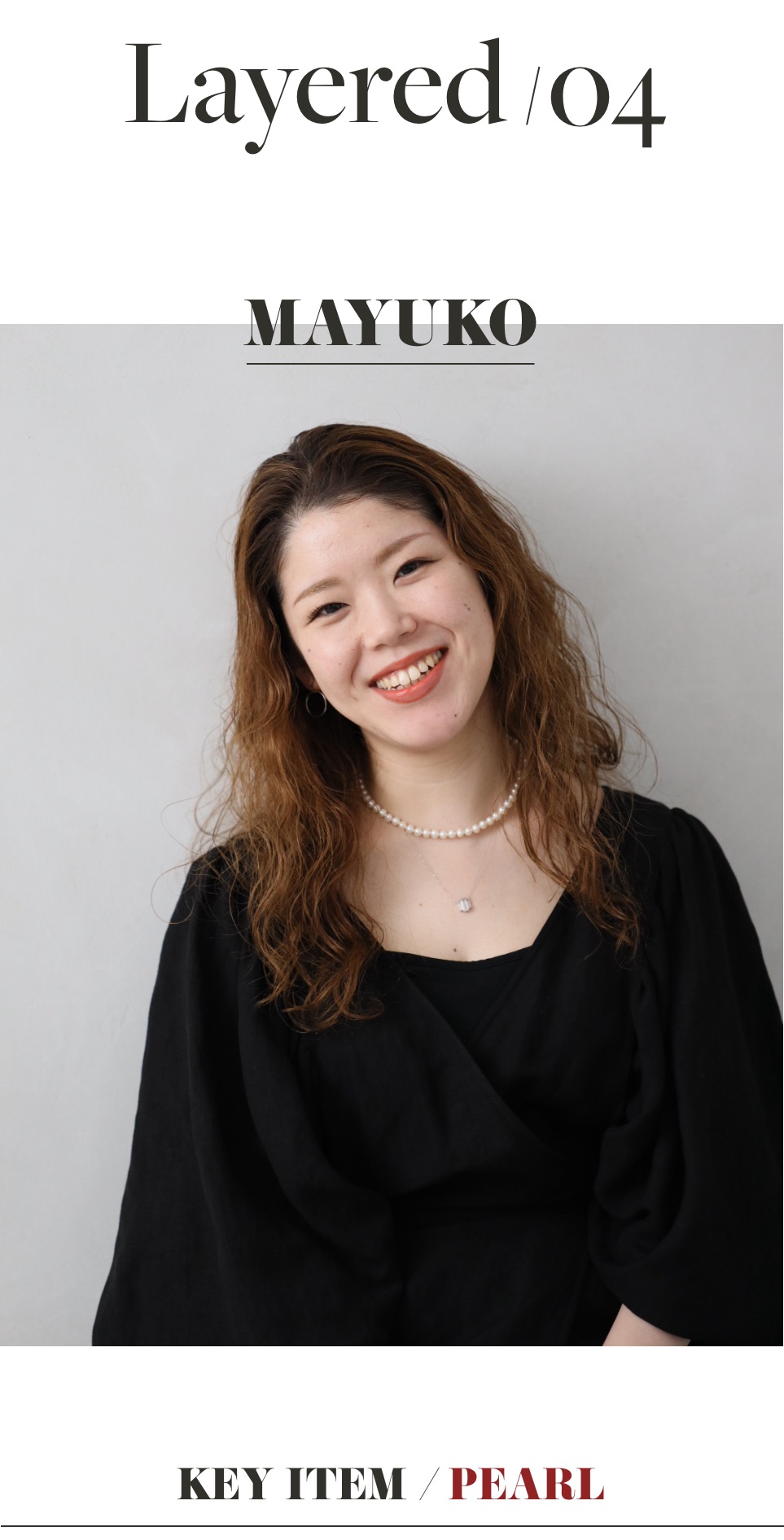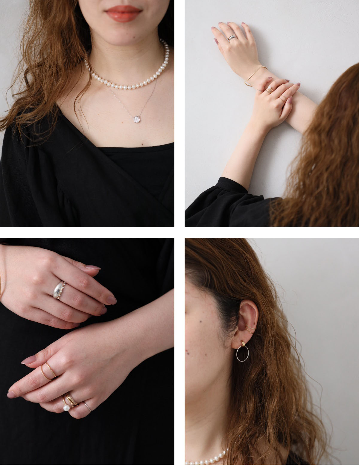 - ベーシックなパールネックレスに天然石のネックレスを合わせてカジュアル感をプラス。全体的にシルバーをミックスした涼しげに見えるコーデ。上品なムードになるようダイヤモンドをさりげなく重ねました。