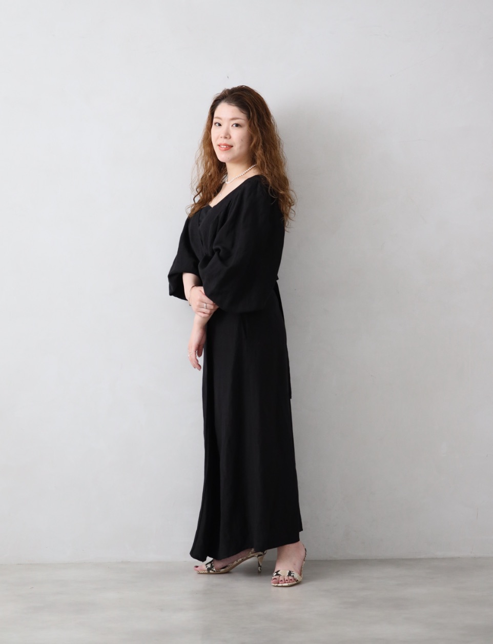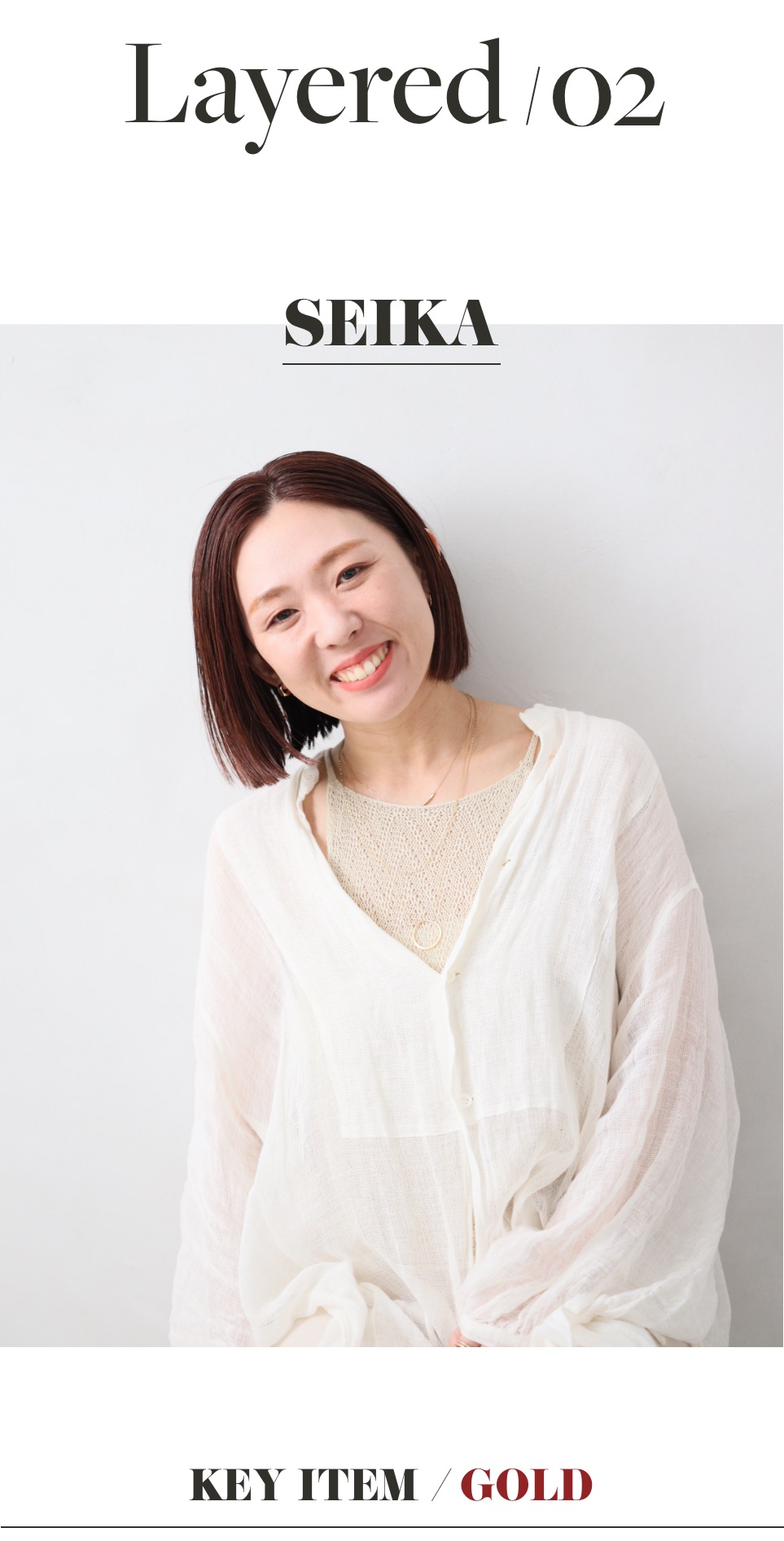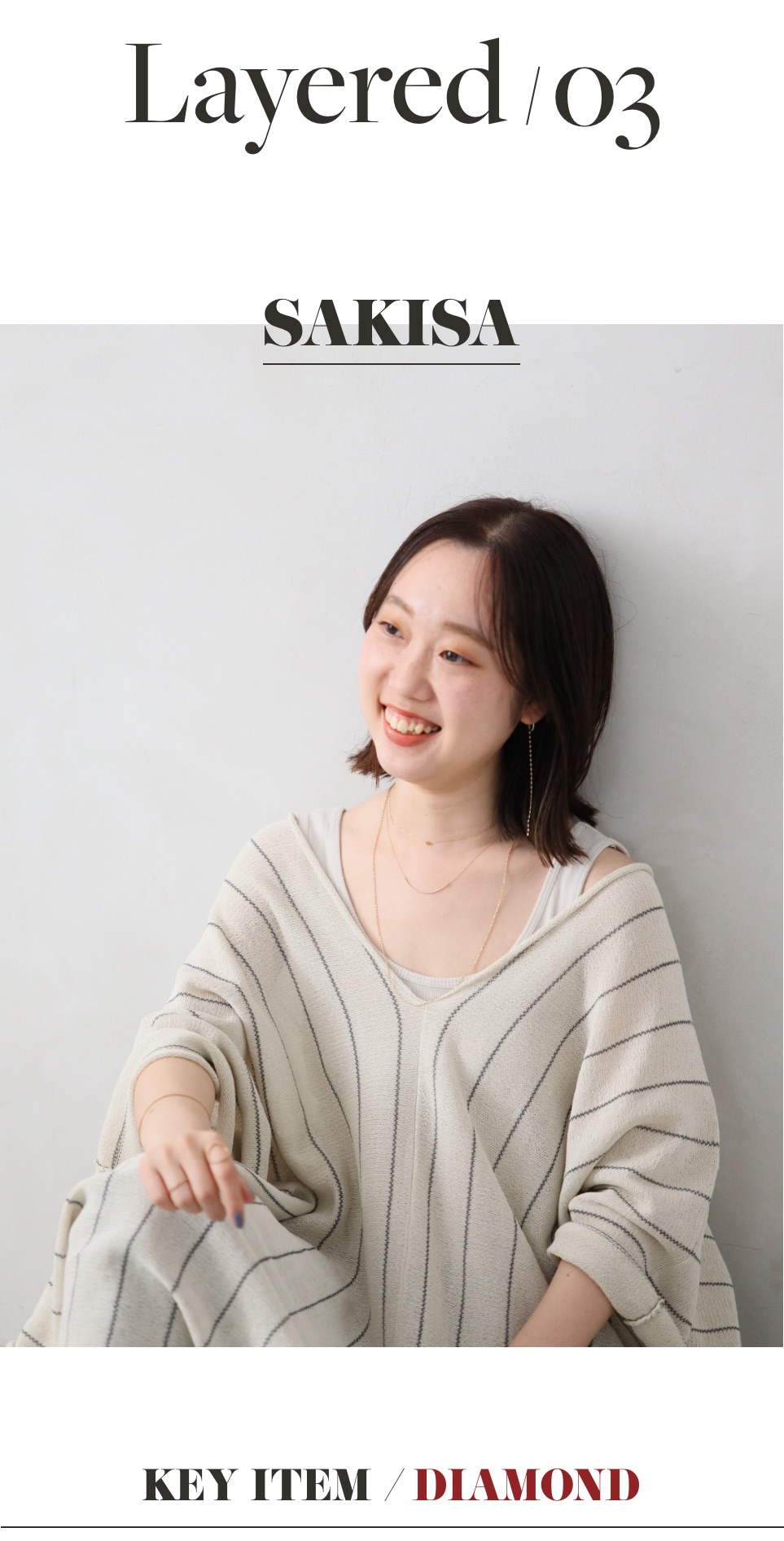 - 地金を主役にしたボリュームのあるレイヤード。ネックレスの重ねづけをコーデのポイントにしています。耳元はシンプルにして、手元にはダイヤモンドを合わせることで大人の女性らしい雰囲気に。