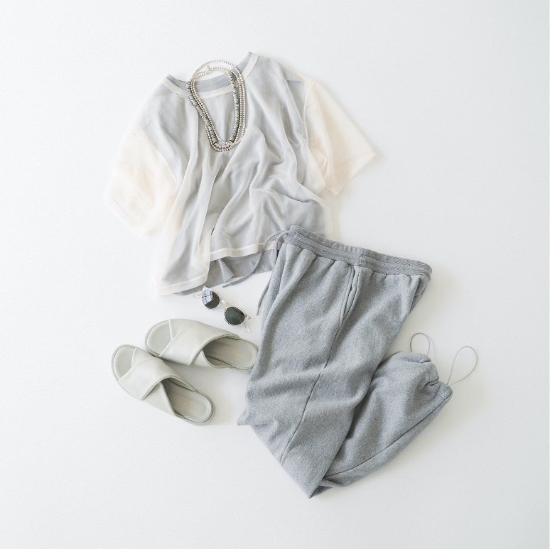 ストリートな雰囲気を感じるカジュアルなアイテムをシアーで透け感のあるアイテムと合わせた、肩の力が抜けたラフでレディライクな着こなしが今月のムード。