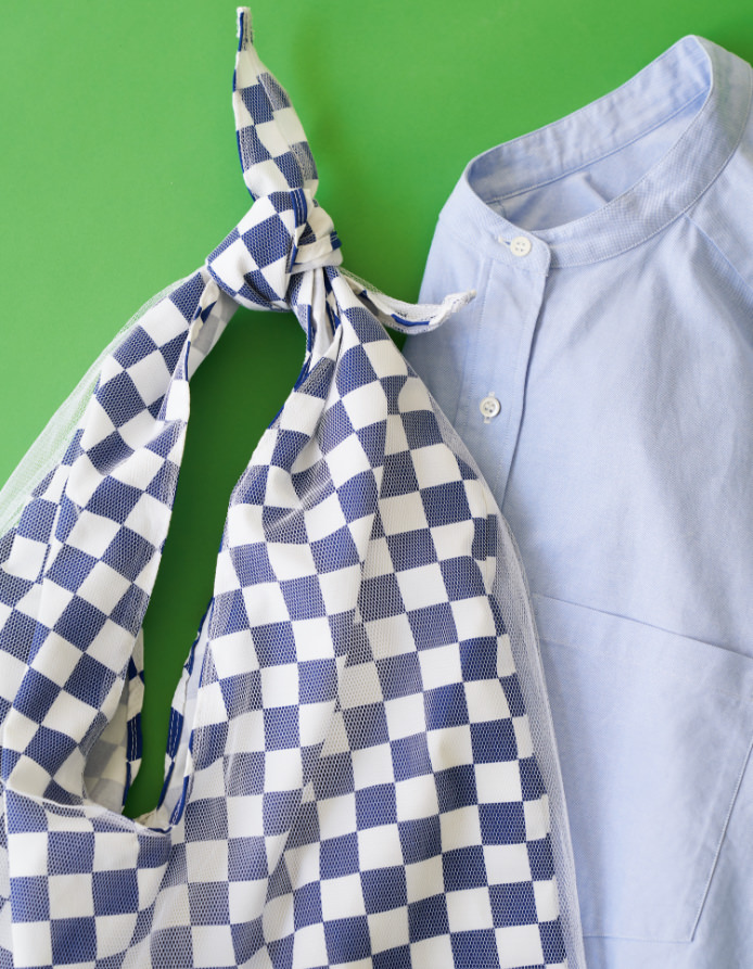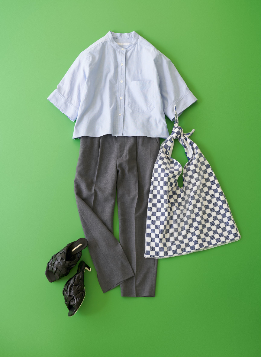 トラッドアイテムの象徴でもあるオックスシャツを思い切ってショート丈にすることでモードな印象にアップデート。きれいめパンツを合わせてハンサムに着こなして。チェッカーフラッグにシアー素材を重ねて作ったバッグをポイントに遊び心をプラス。
