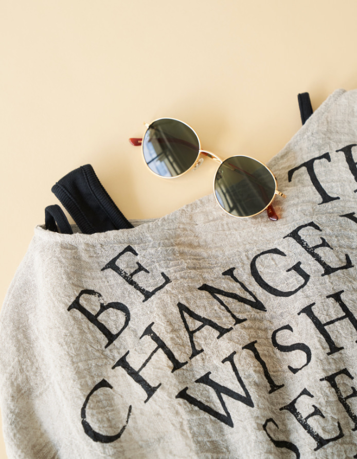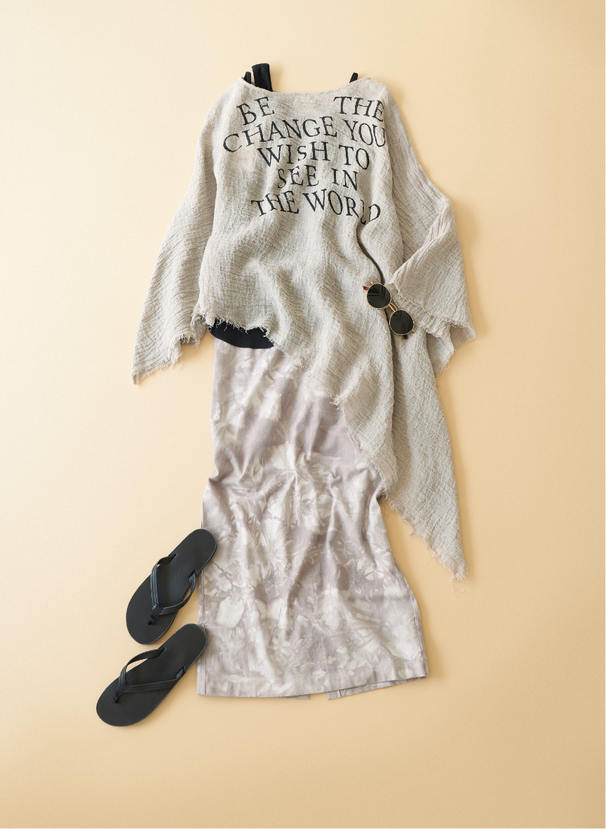 女性らしさを引き立てるタイトスカートに大胆なロゴがプリントされたポンチョを合わせたリラックス感がありながらも女性らしい、夏の準備にぴったりのコーディネート。オーバーサイズのポンチョは腰回りをカバーしながらもスタイルアップも叶う大人に嬉しいアイテム。