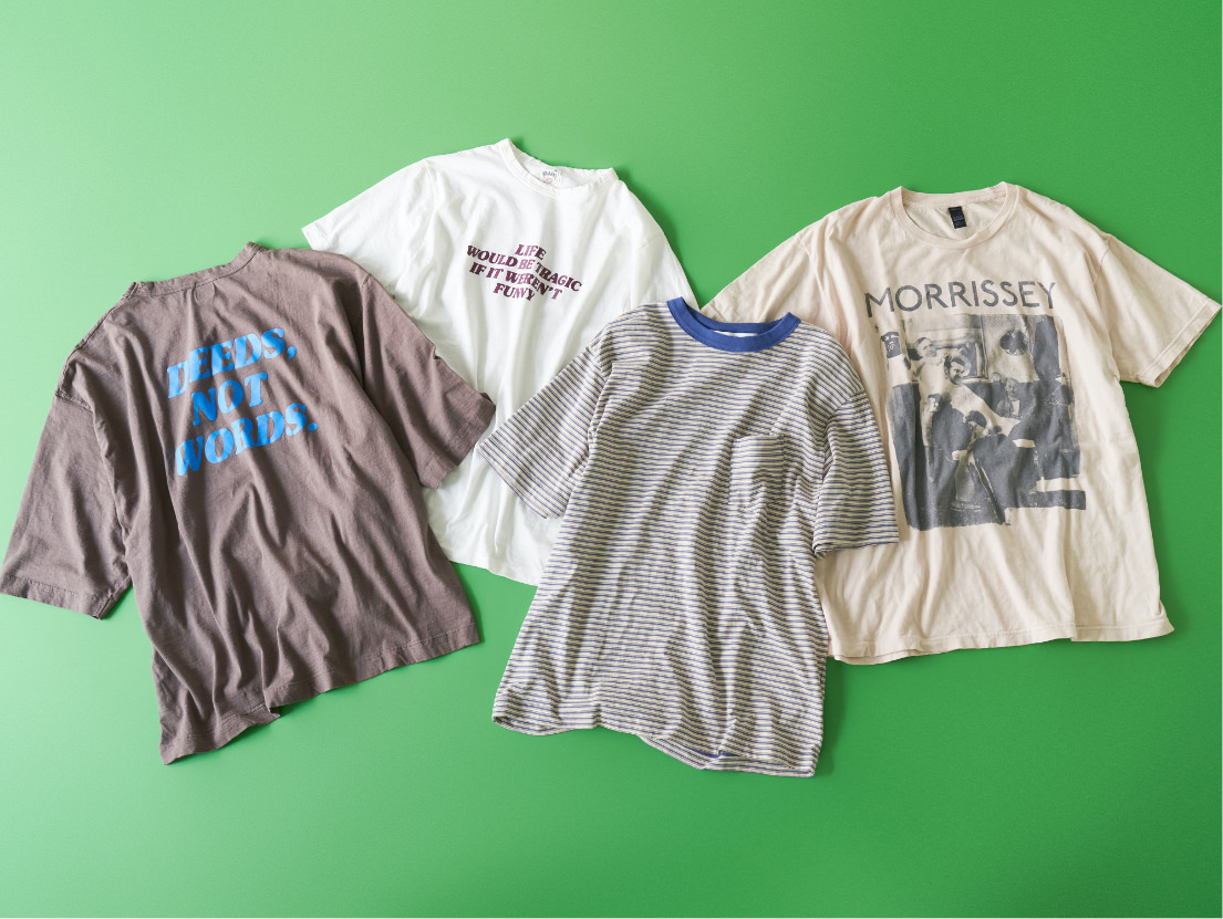 毎年ついつい集めたくなるカジュアル好きには欠かせないアイテム、Tシャツ。今年はちょっとエッジの効いたTシャツが気分。背中の大きいロゴプリントが印象的なTシャツやどこか懐かしい雰囲気が今の気分にはまるマルチボーダーのTシャツ、ヴィンテージ加工の入ったバンドT。一枚で着映えする使い勝手の良いTシャツが勢揃い。