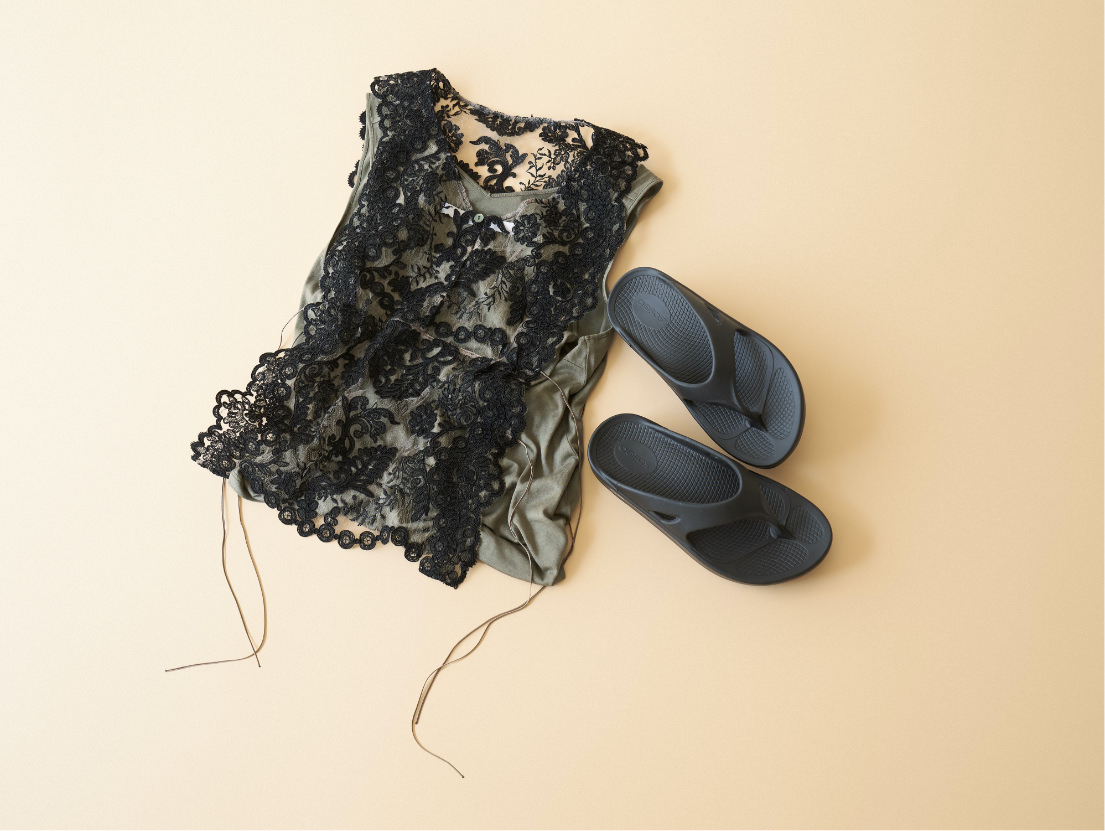 繊細でそれだけでセンシュアルさを感じられるレースアイテムは、思いきってスポーティーなサンダルを合わせて。スエットパンツやチノパンツなどカジュアルボトムなど、とことんカジュアルなアイテムもグッと女っぽいスタイリングにアップデートしてくれる新たにワードロープに加えたいアイテム。