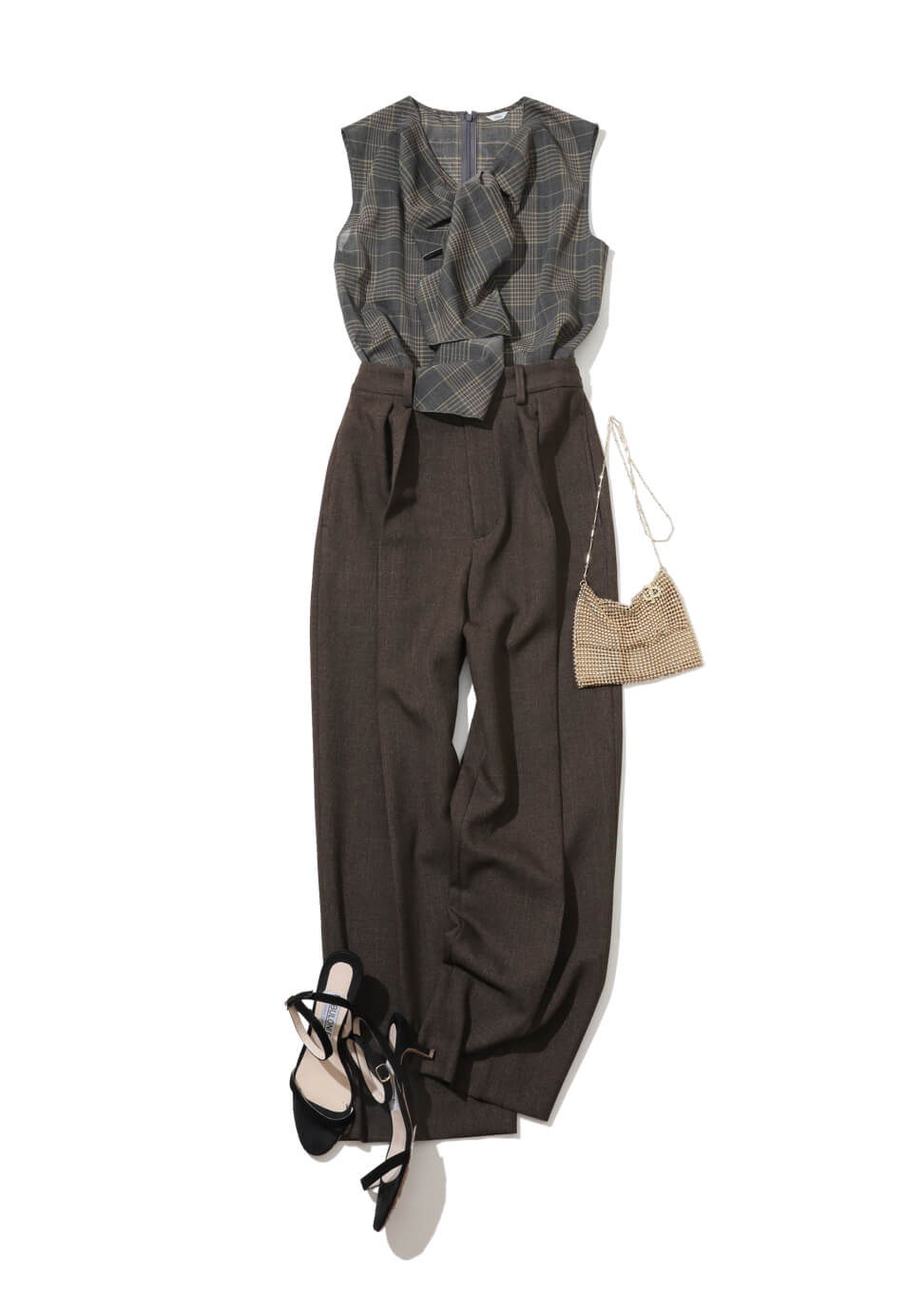 厳しい残暑で重たい洋服は着たくない!そんな時は1枚でサマになって快適な、夏素材の秋服が心強い味方。見た目にも軽いシアー素材のボウタイブラウスは、秋めいたチェック柄で季節感を漂わせて。トレンドのこげ茶のハンサムパンツでピリリと引き締めを。チェーンバッグや華奢なストラップサンダルで、リュクスな味付けをお忘れなく。