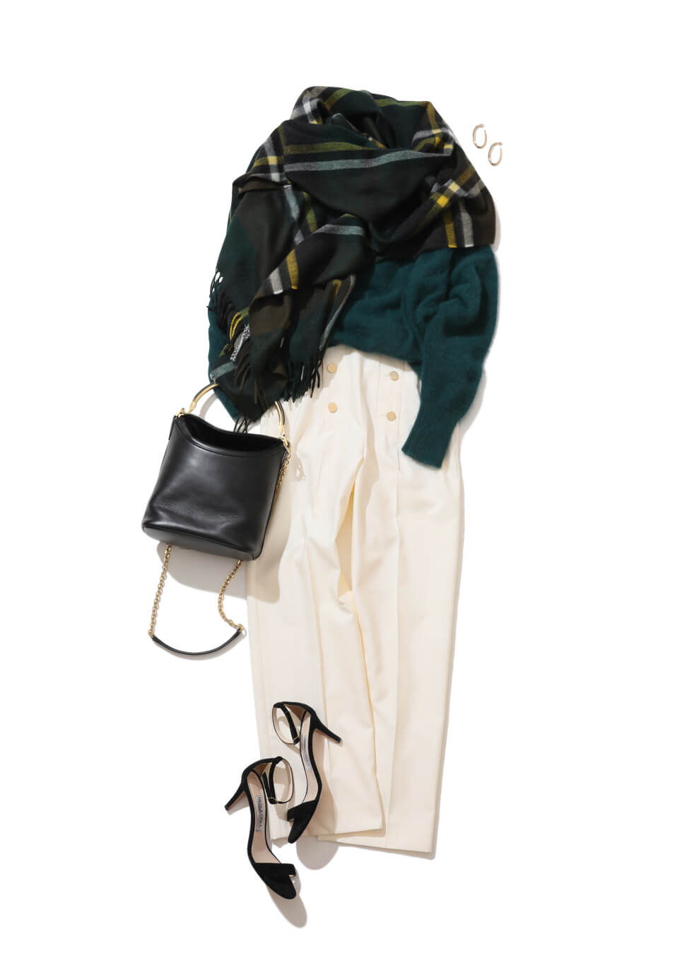 白のマリンパンツをマニッシュに着こなしたい気分の日は、トレンドのグリーンのニットをオン。アンゴラ混のドルマンスリーブニットなら、女らしいシルエットで端正なムードも漂わせます。黒のパンプス&バッグで、キレイめをキープ。ニットと色味を合わせたチェックストールをラフに肩掛けして、寒暖差を調節。