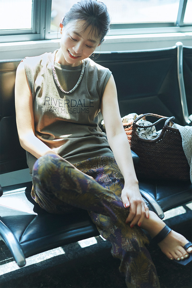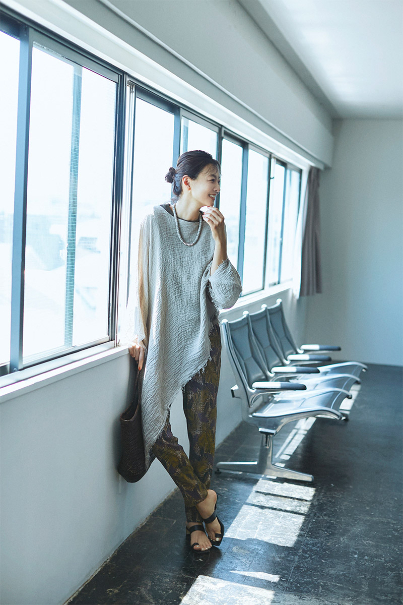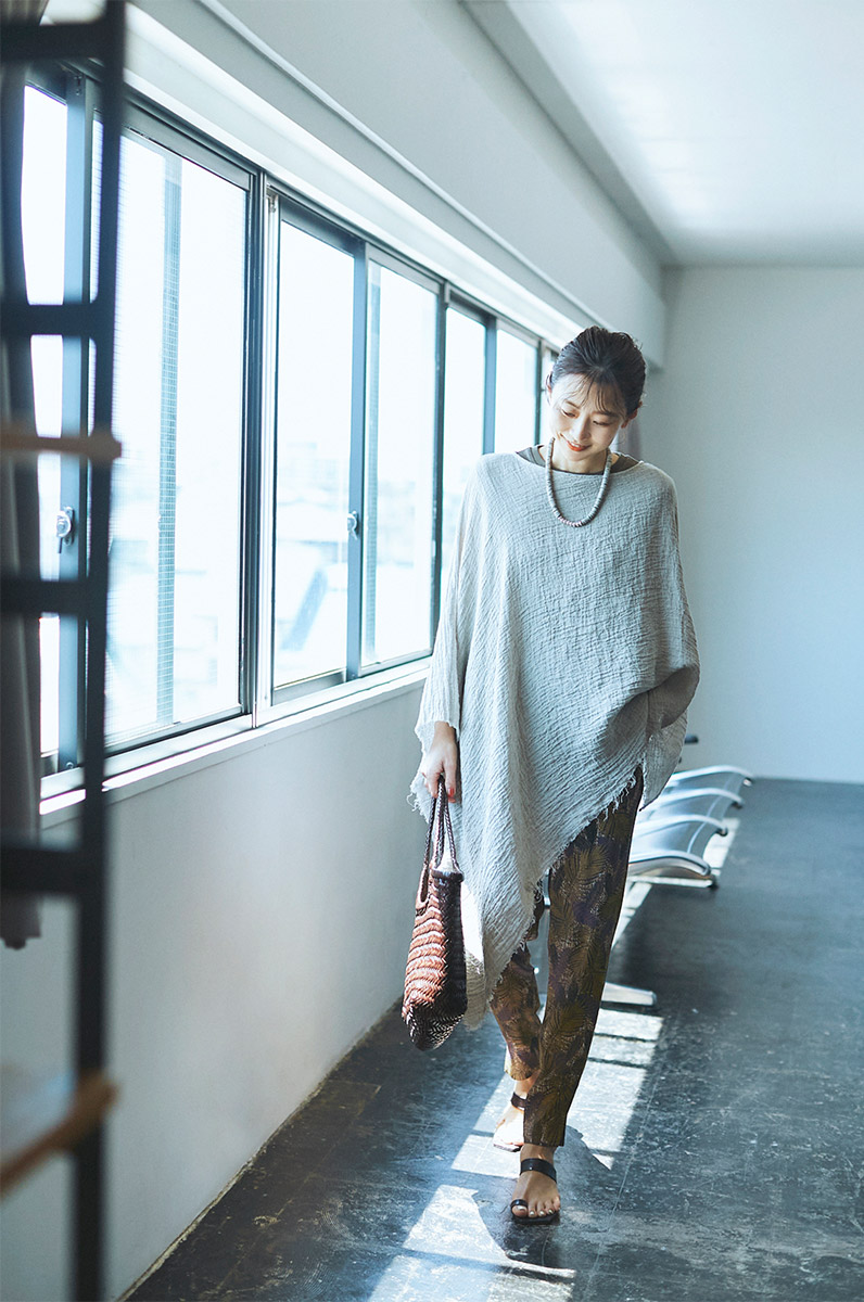 「ヴィンテージ加工のロゴTと柄パンツの色をリンクさせた、街で着られるエスニックスタイル。合わせたリネンポンチョは冷房対策や日除け、体型カバー効果があり、持ち運びもしやすいので、これからの季節に最適!」