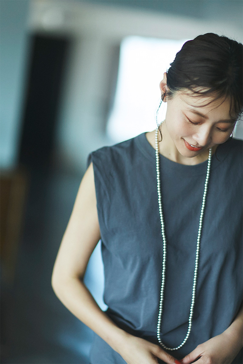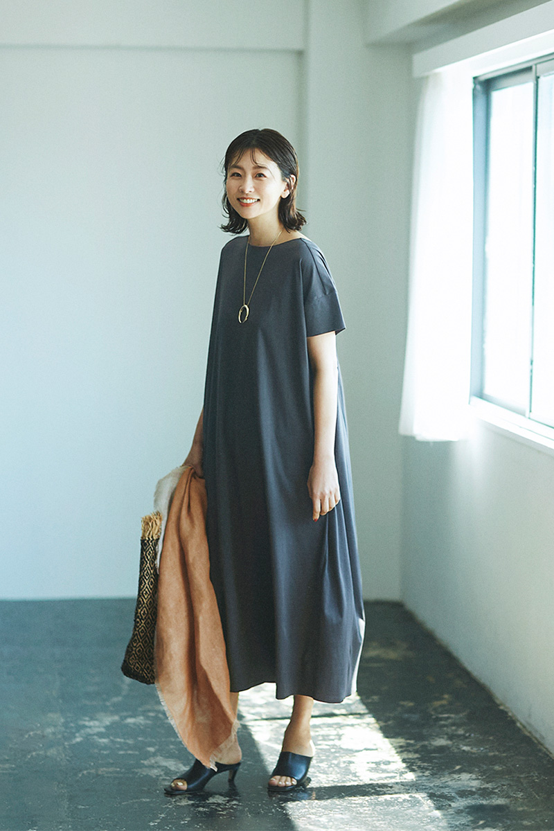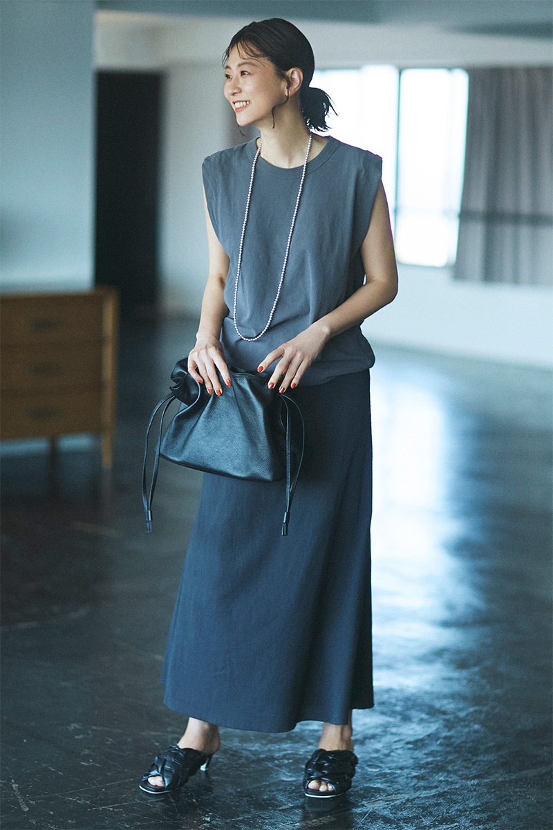 「チャコールグレーやスミ黒のアイテムを使っているので、モノトーンと言えど優しげな印象。清涼感のある夏素材はラフに傾きがちですが、こういう配色で着れば、大人っぽく洗練されたスタイリングが完成します」