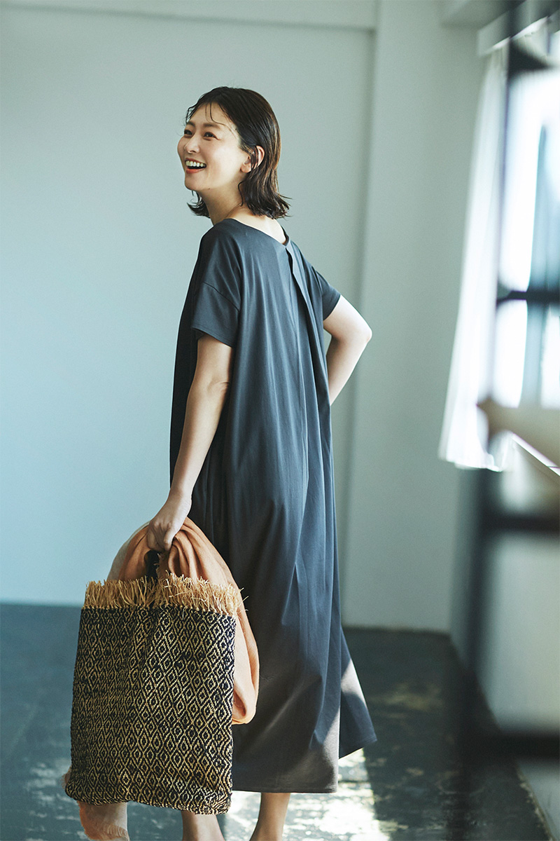「夏に便利な重ね着いらずのワンピース。気楽に着られる素材とデザインながら、気の利いたディテールが散りばめられていて、透ける心配もなし。おうち時間はもちろん、お出かけシーンにも活躍すること確実です」