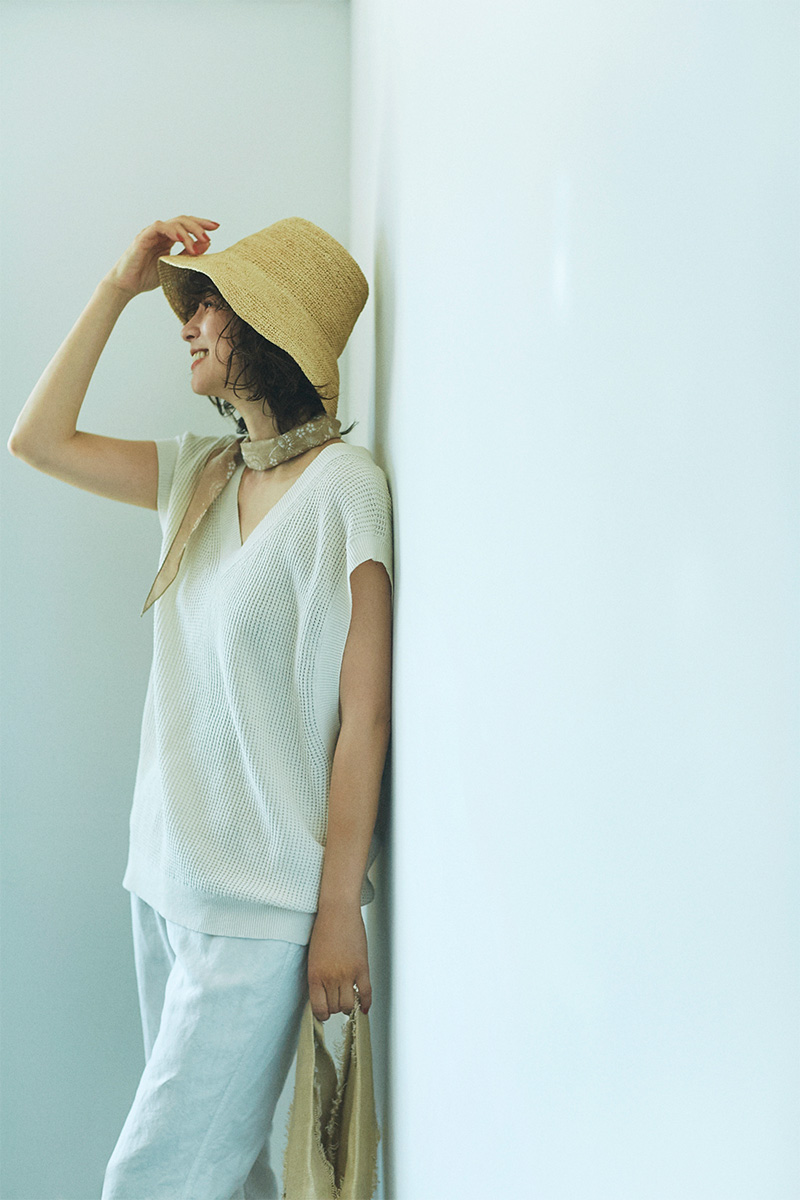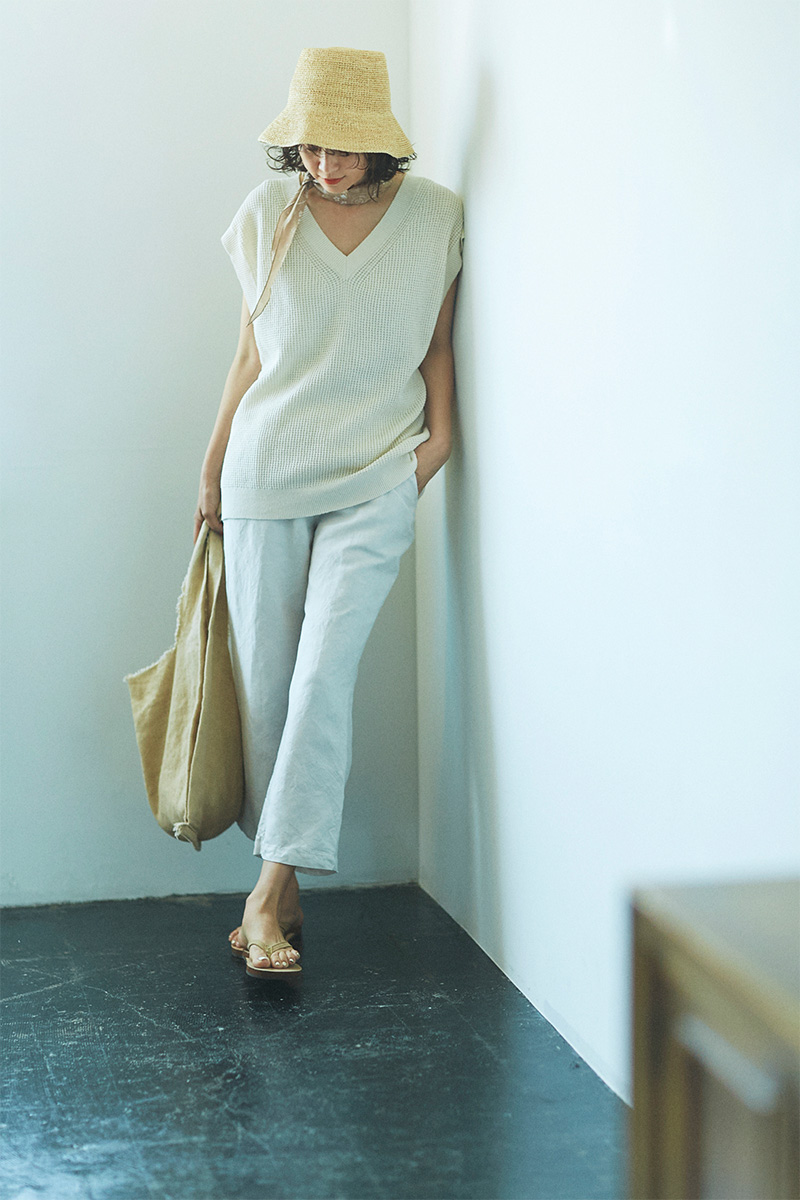 「オフホワイト〜ベージュでまとめた旬のグラデーションコーデです。Vネックニットの絶妙な襟あきと袖丈、フレンチリネンパンツのセミフレアシルエット&丈感など、鮮度UPを約束するポイントもお見逃しなく」