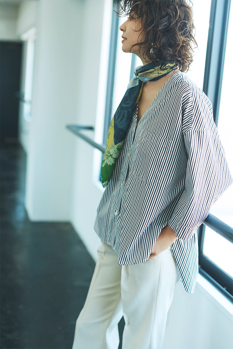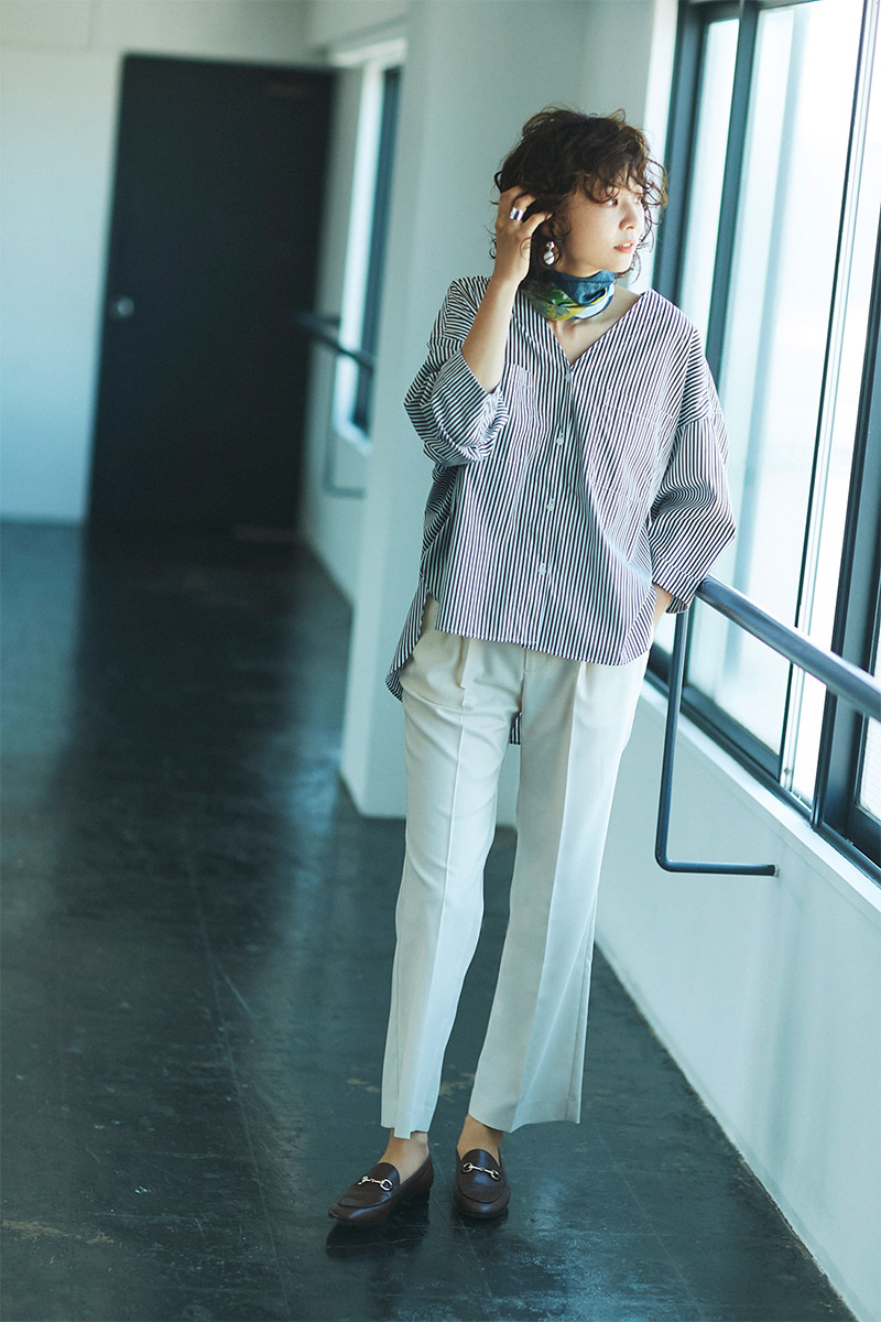 「気負わずに着られて、きちんと見える、なんとも涼しげなVネックのオーバーサイズシャツ。きりっとしたストライプを選んで、今年らしいセミフレアパンツを合わせ、好感度の高いトラッドな着こなしに仕上げました」