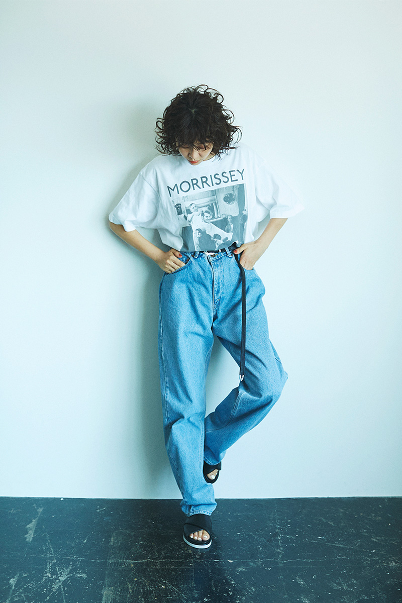 「ストリートムード漂う装いを、オーバーサイズのアイテムで表現しました。Tシャツをタックインしたら、デニムのウエストを長いベルトできゅっと絞って。小物を格上げ力のある黒レザーで統一すれば、大人っぽさも上々」