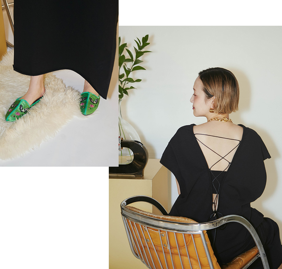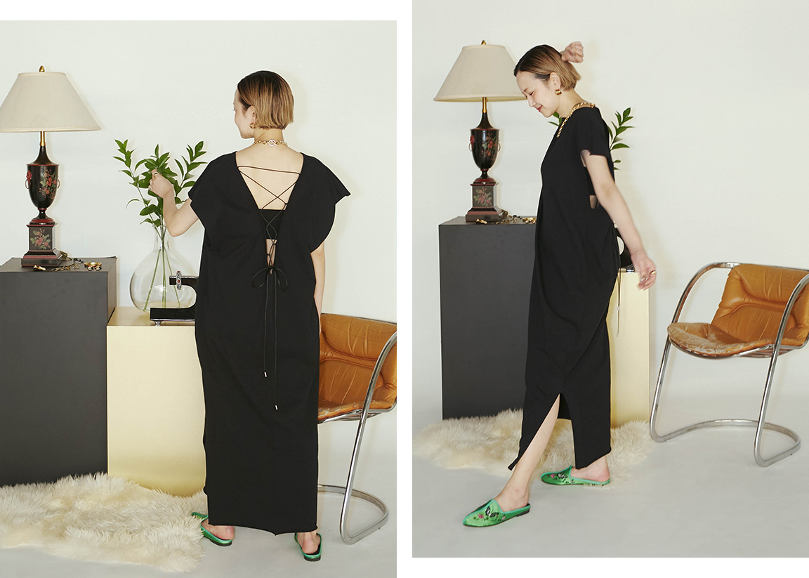 満を持して完成したFUJINTREE for CITYSHOPのチャイナミュールで‘大人の余裕と抜け感’を。- CITYSHOPBACK LACE UP DRESS:ワンピース¥16,500(税込)