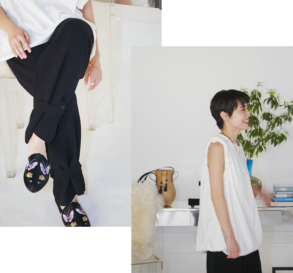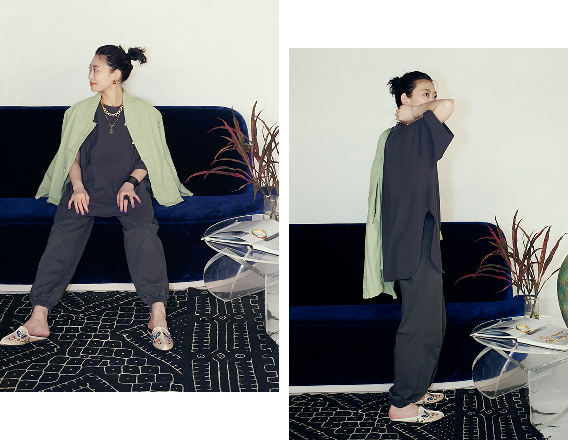 ライムグリーンのチャイナシャツ+ミュールで、リラックス感にシノワズリを効かせて締めるだけ!