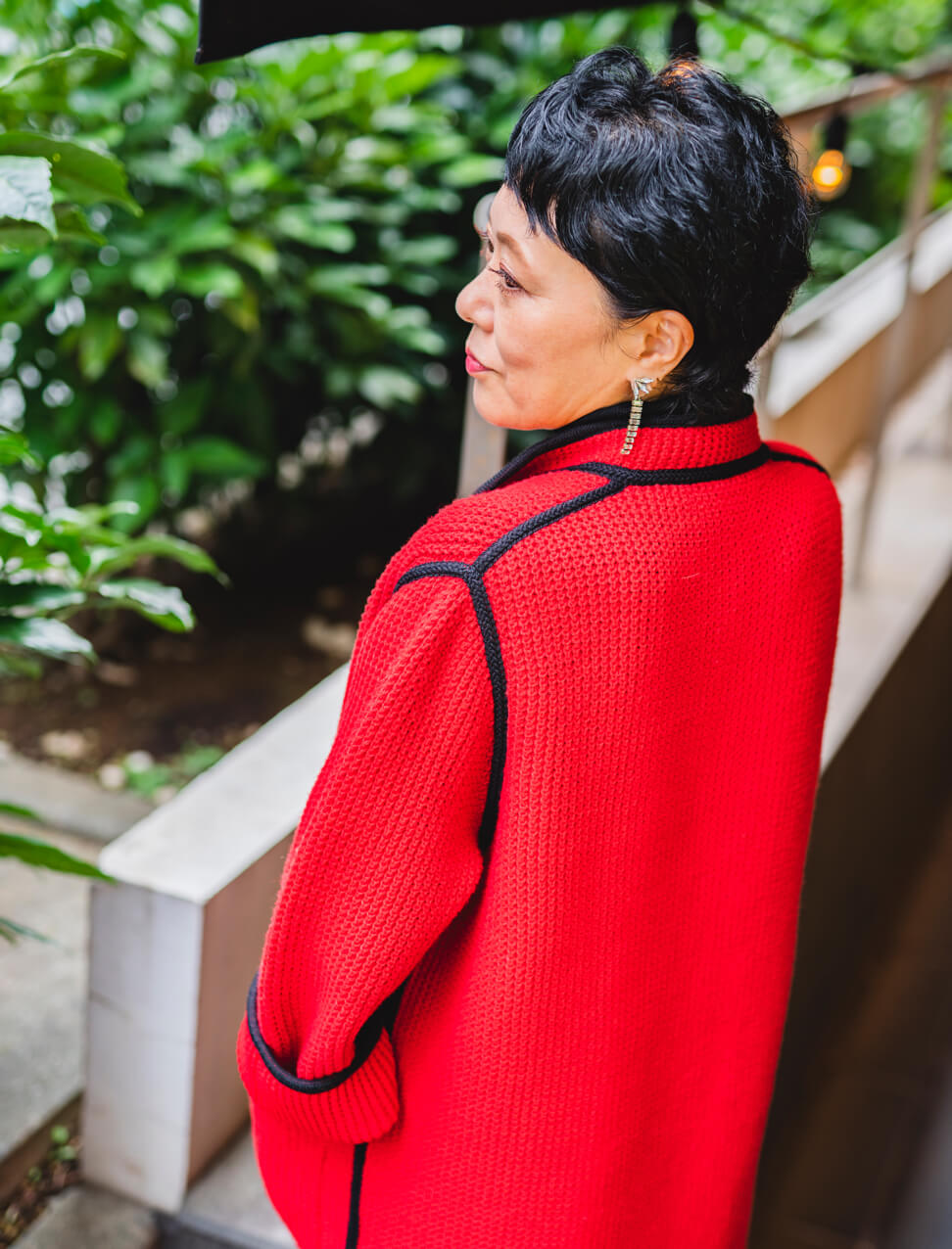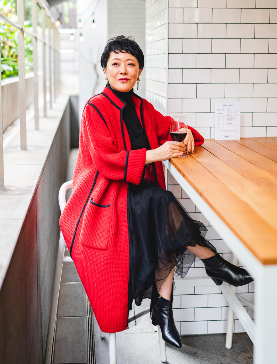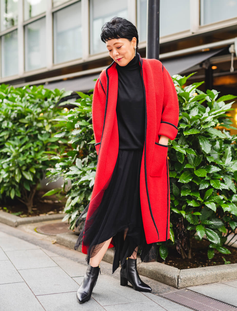 - 目を引く赤のニットコートを、ブラックとの掛け合わせでモードな着こなしに。強くなりすぎないように、インナーは華奢なチュールスカートをふんわりとはためかせて。