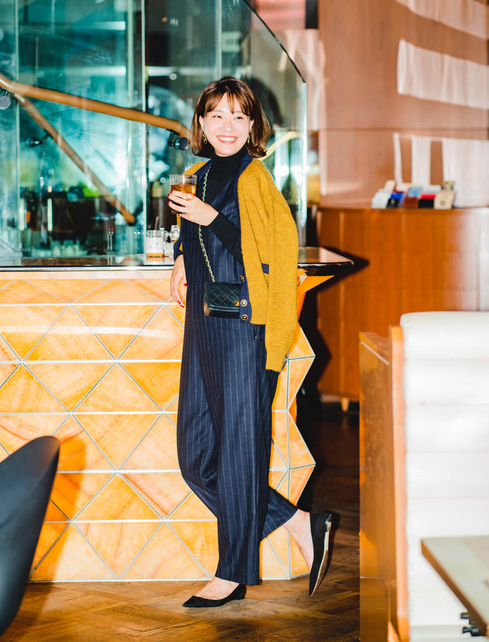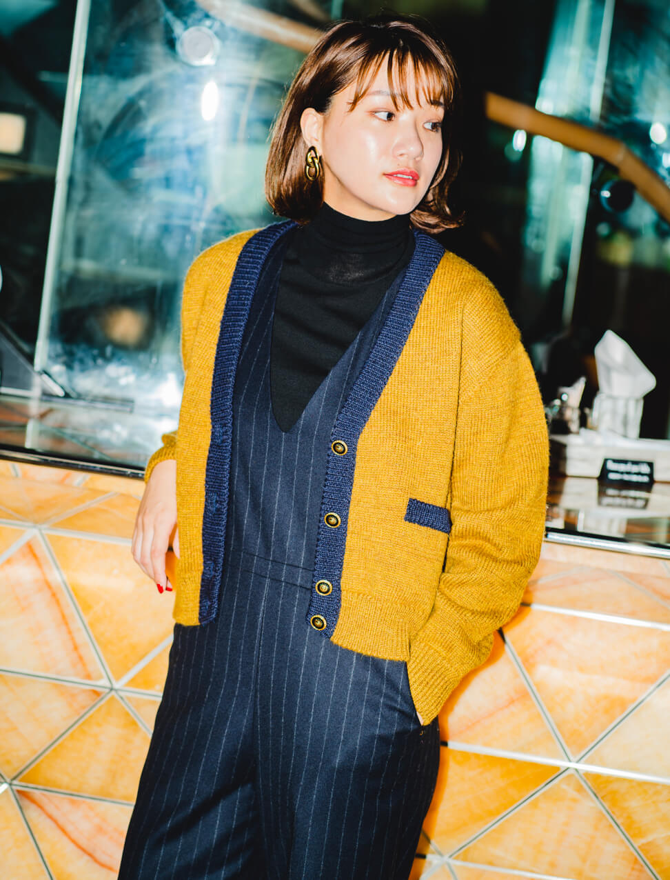 - トラッド×スポーティなチルデンカーディガンをラフに肩掛け。コンパクト丈だからバランスも取りやすくて◎。ハンサムなチョークストライプのジャンプスーツやチェーンバッグで、幼く見えない配慮を。