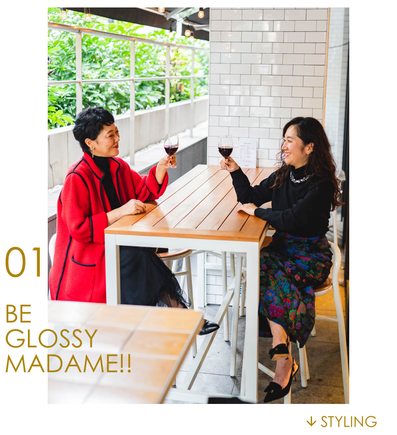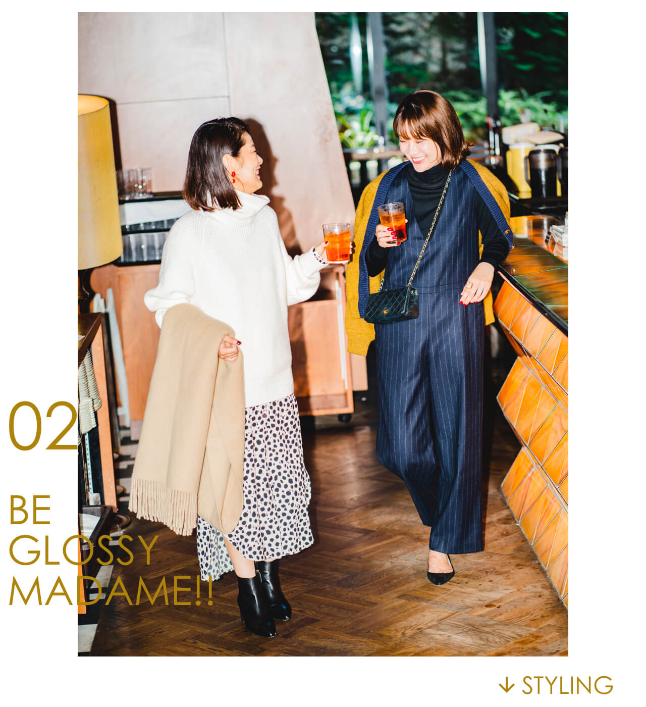 - TIPS / シックな色味のニットに映える赤リップで華やかに。首元には、きらめくビジューネックレスでさらにグロッシーにまとめて。