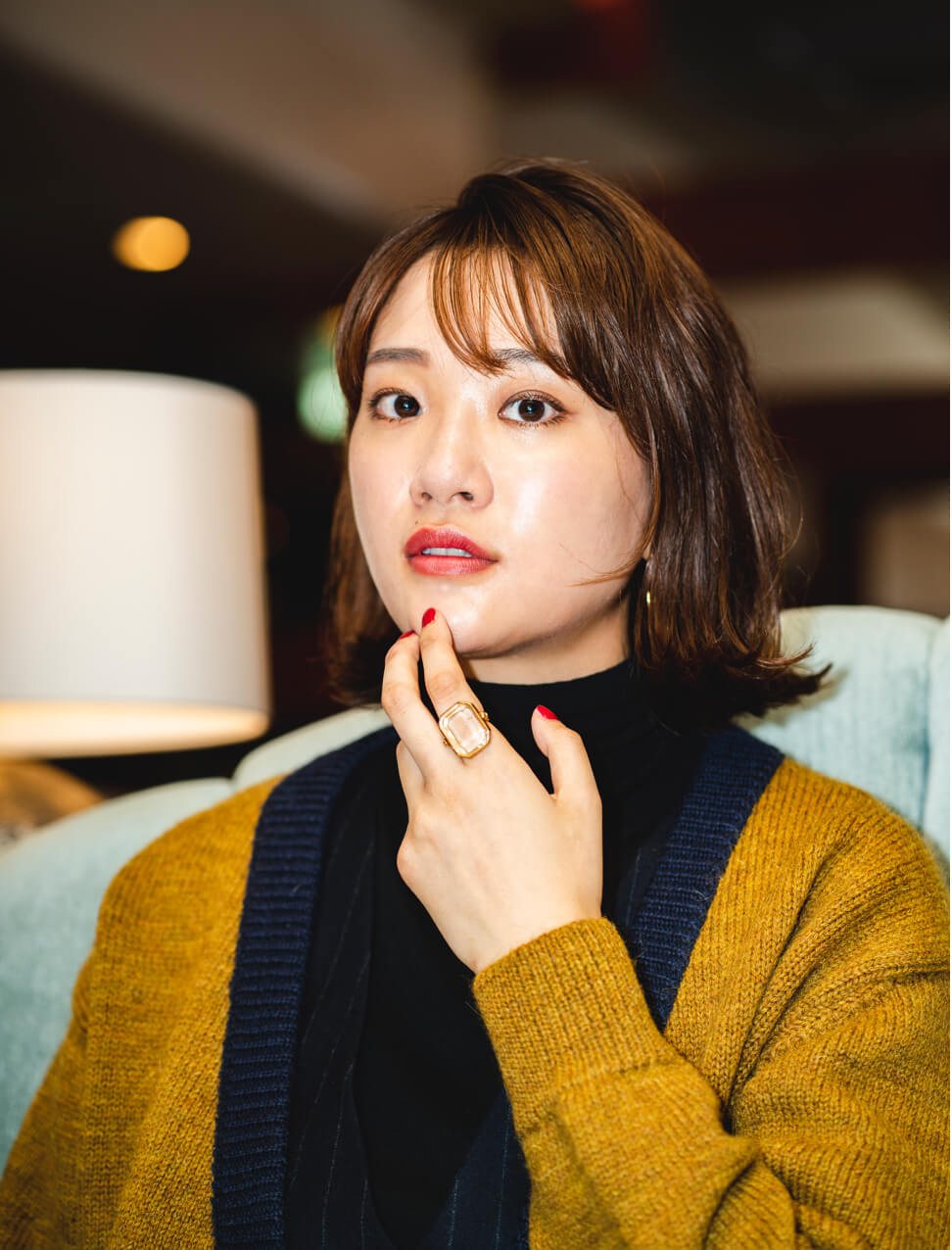 - TIPS / 秋冬になるとつけたくなるのが、気持ちが高揚する赤ネイル。クールなスタイリングと対照的な手元が印象的。レトロなストーンリングもこなれたワンポイントに。
