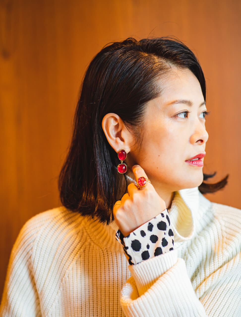 - TIPS / すれ違う人たちの視線を集める、真っ赤なイヤリングとリング。主張のあるカラーながら丸みを帯びた可愛らしいフォルムだから、気負わずつけられそう。