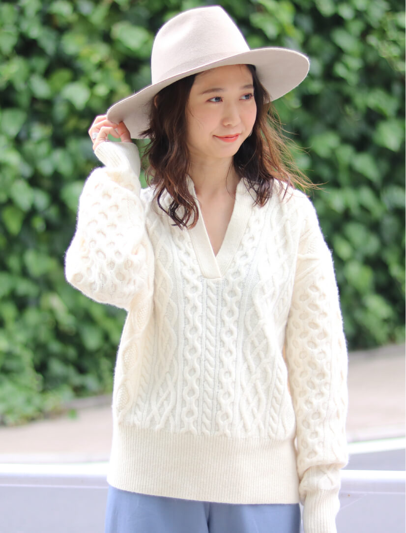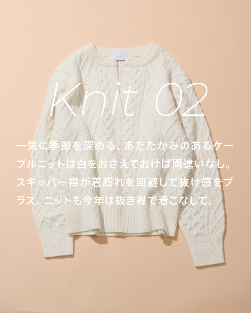 - ふんわりと心地よいワッフル編みのニット。ゆるっと肩を出した着こなしが、こなれ感をたっぷり醸し出します。キレイめな着こなしのハズしに取り入れて。