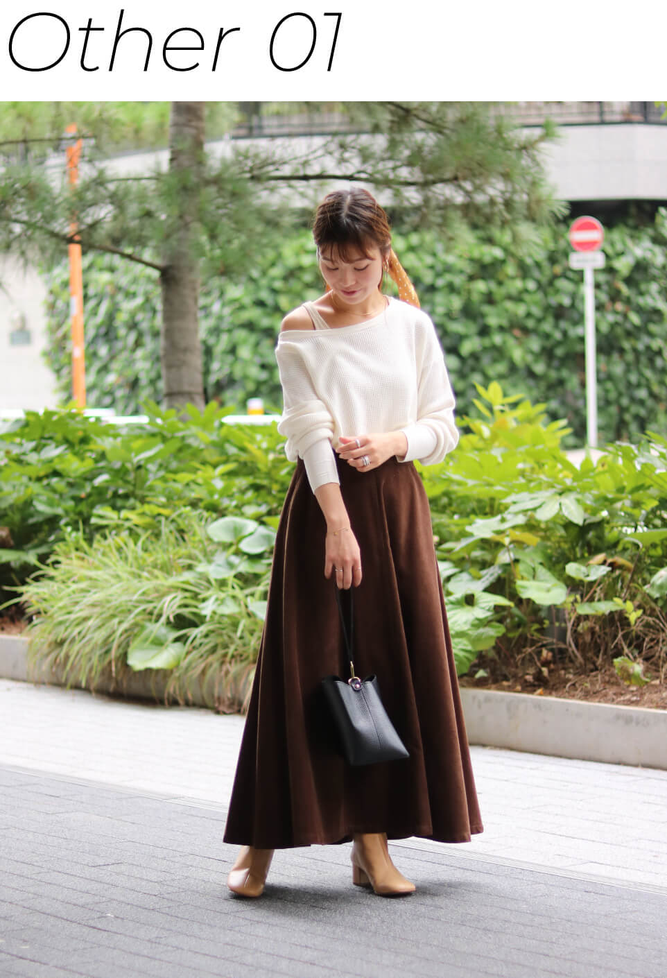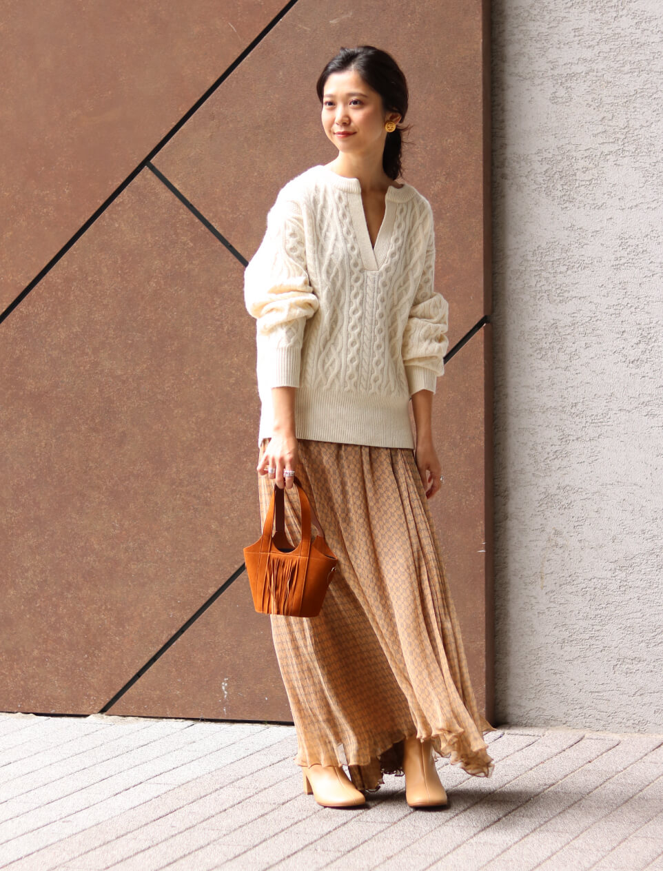 - ケーブルニットとマキシスカートのコーデも、スキッパーの抜け感でぐっと今っぽく鮮度がアップ。フォークロア調のバッグやベージュのブーツで、さらに秋らしく更新。