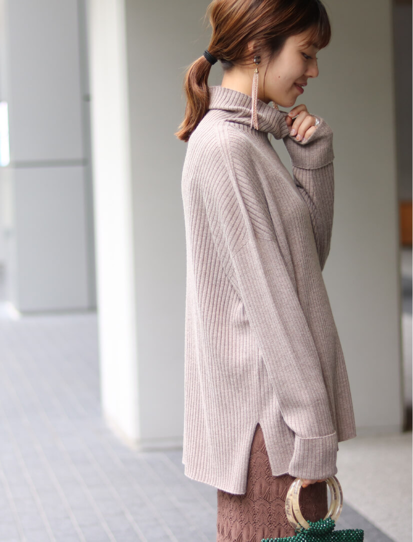 ロングピアスやゆるめのタートルネックで、動きとニュアンスのある顔周りに。