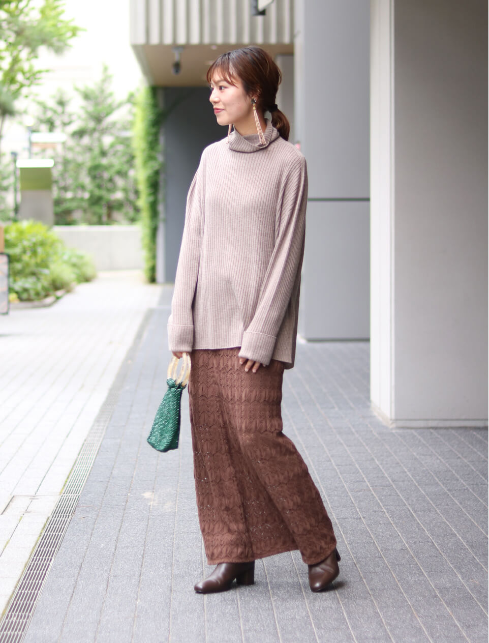 - 女性らしくてイージーなレーススカートで、全身ブラウンのグラデコーデをメイク。