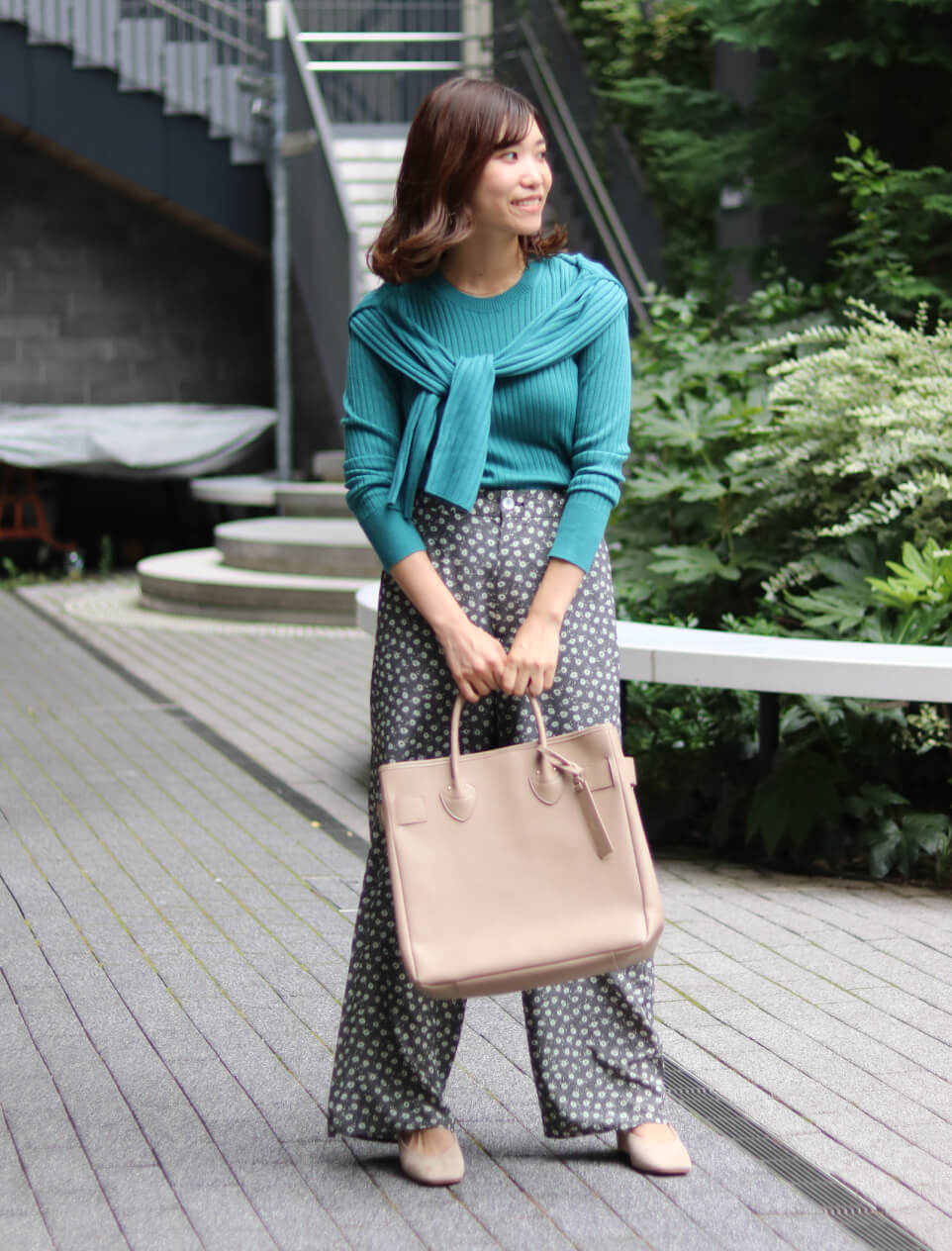 - 1枚で決まるフラワーパンツなら、重たくなりがちな秋冬スタイルも華やかに。さらに鮮やかなブルーのアンサンブルをラフに合わせれば、着映え効果も◎。