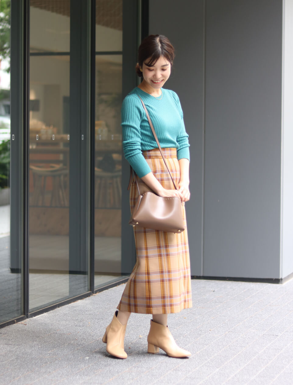 - 優しいオレンジのトーンがチェック柄を女性らしくアップデートしたペンシルスカート。ベージュ小物で馴染ませて。