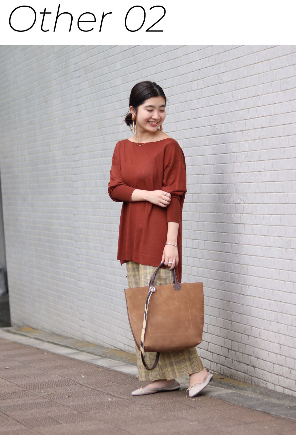 - コーデを選ばずさらりと着こなせて普段使いにぴったりのゆるニットは、ヒップが隠れる着丈がパンツと好相性。デコルテラインを美しく見せるボートネックはアクセがよく映えそう。