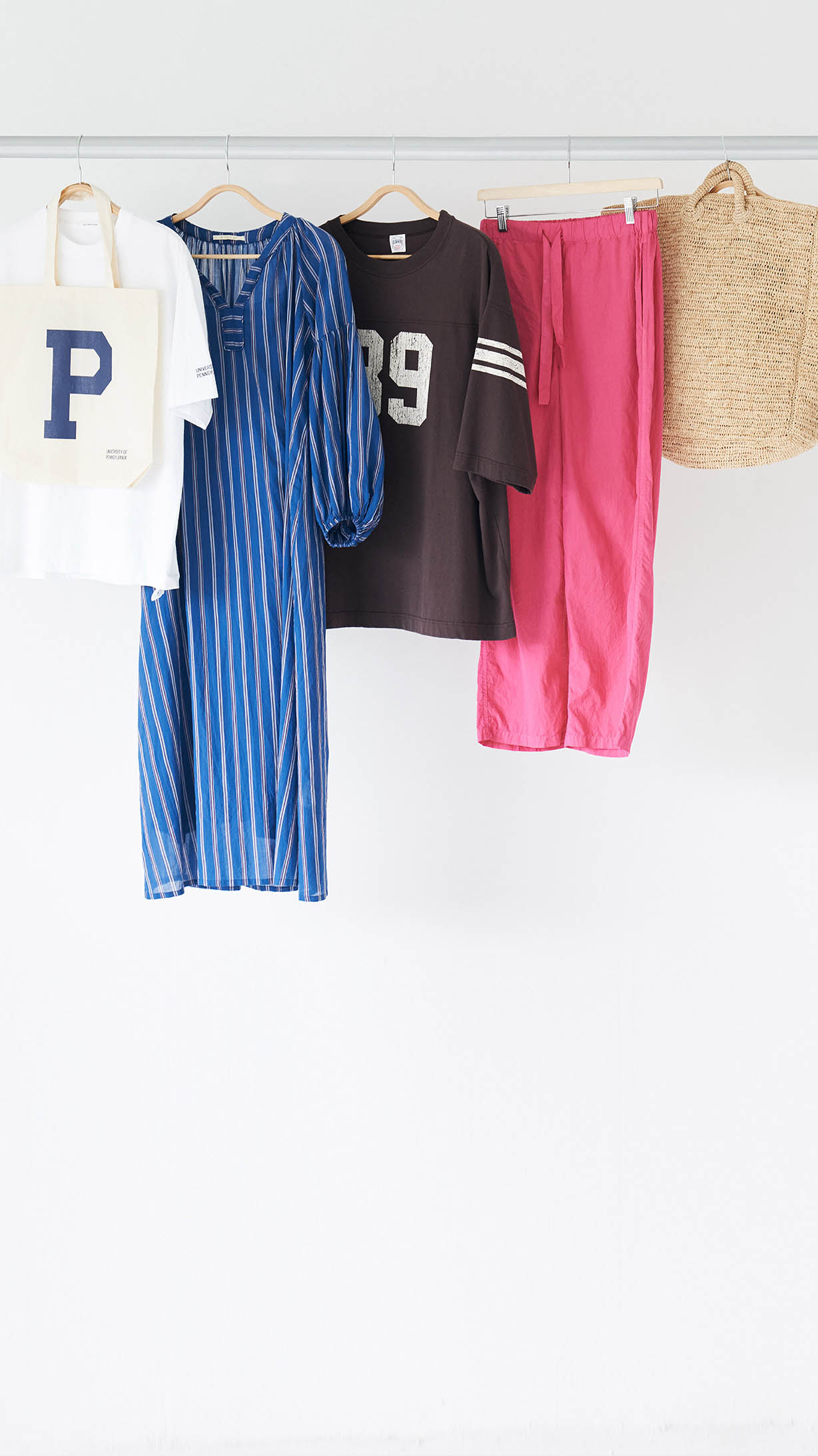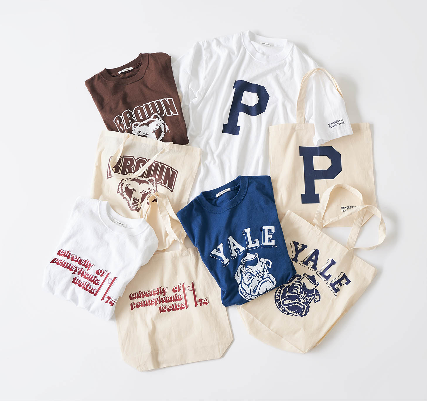 オフィシャルコラボTシャツの第2段となる今回はカレッジTシャツ。メンズのLサイズに近いサイズ感でありながら肩、襟のデザインを工夫することでオーバーサイズながらコンパクト見えするデザインに。腕が細く見えるよう太めの長い袖をつけ、また、ルーズに見えないように着丈も調整。女性が着ることを考え、計算されつくした、まさに大人のためのTシャツ。プリントがお揃いのエコバッグも付いてくるところも魅力。