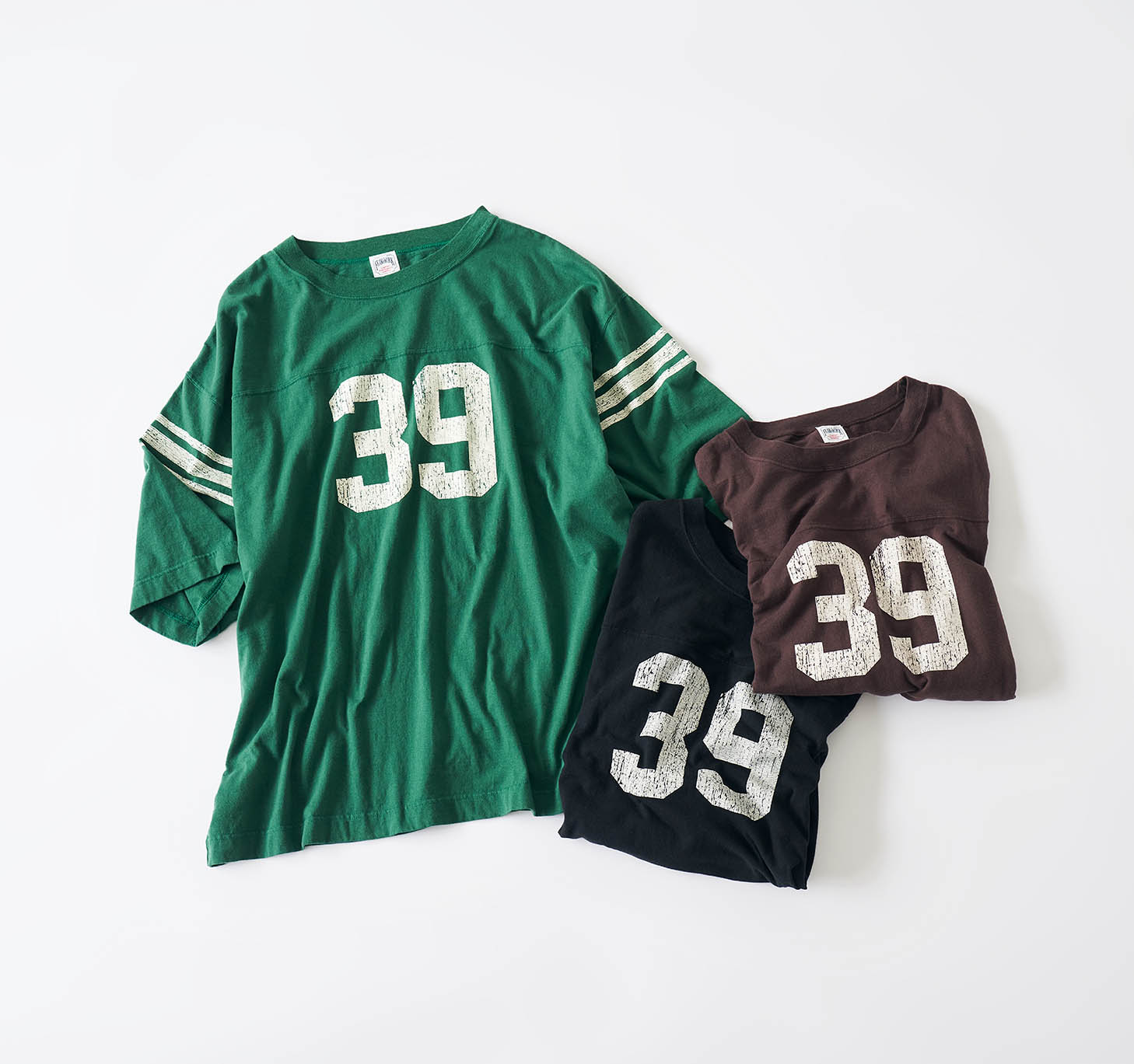 コットン100%の柔らかい素材にかすれたロゴとラインがプリントされ、ヴィンテージライクなこなれ感が魅力のフットボールTシャツ。ガシッと硬くメンズライクな印象になりがちなフットボールTシャツを、大人の女性が着たいと思えるように工夫を重ねた一枚。 いつものスタイリングにとり入れやすい黒、ブラウンに、パッと目を引くグリーンの3色展開。