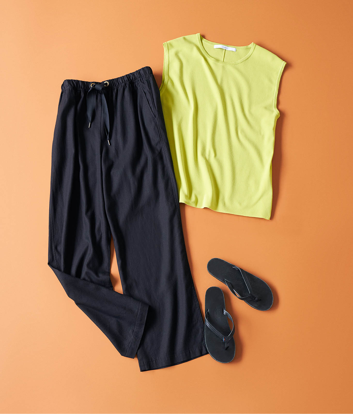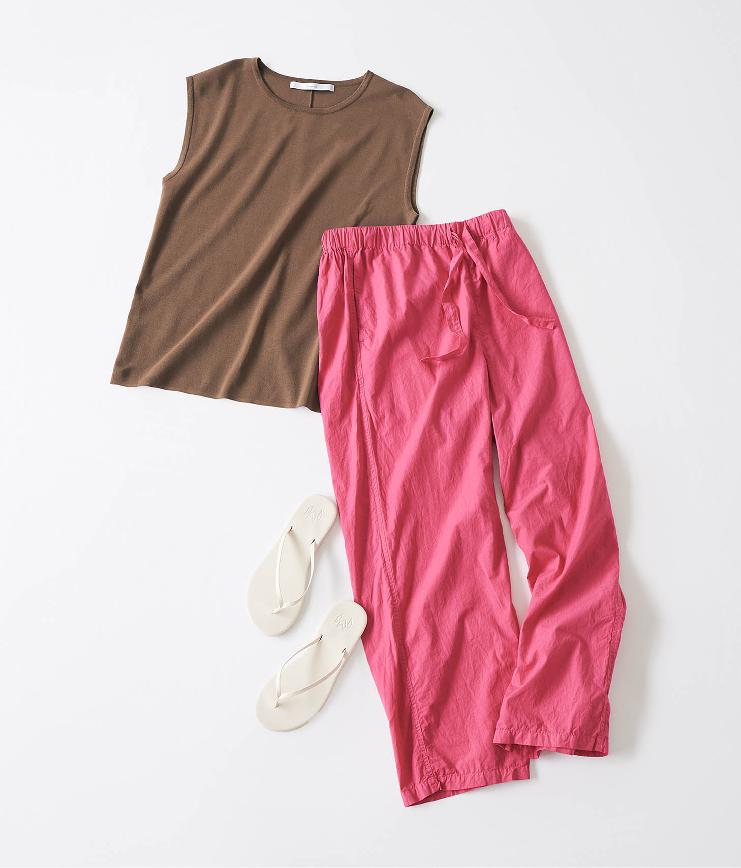 リネンのナチュラルなスラブ感は残しつつ、レーヨンのツヤ感としなやかさを兼ね備えた、ロングシーズン頼りになるパンツ。洗いをかけることにより上品な雰囲気にラフさもプラス。ホールや紐先に金具を付けることでリラックス感がありつつで品のあるスタイルに。
