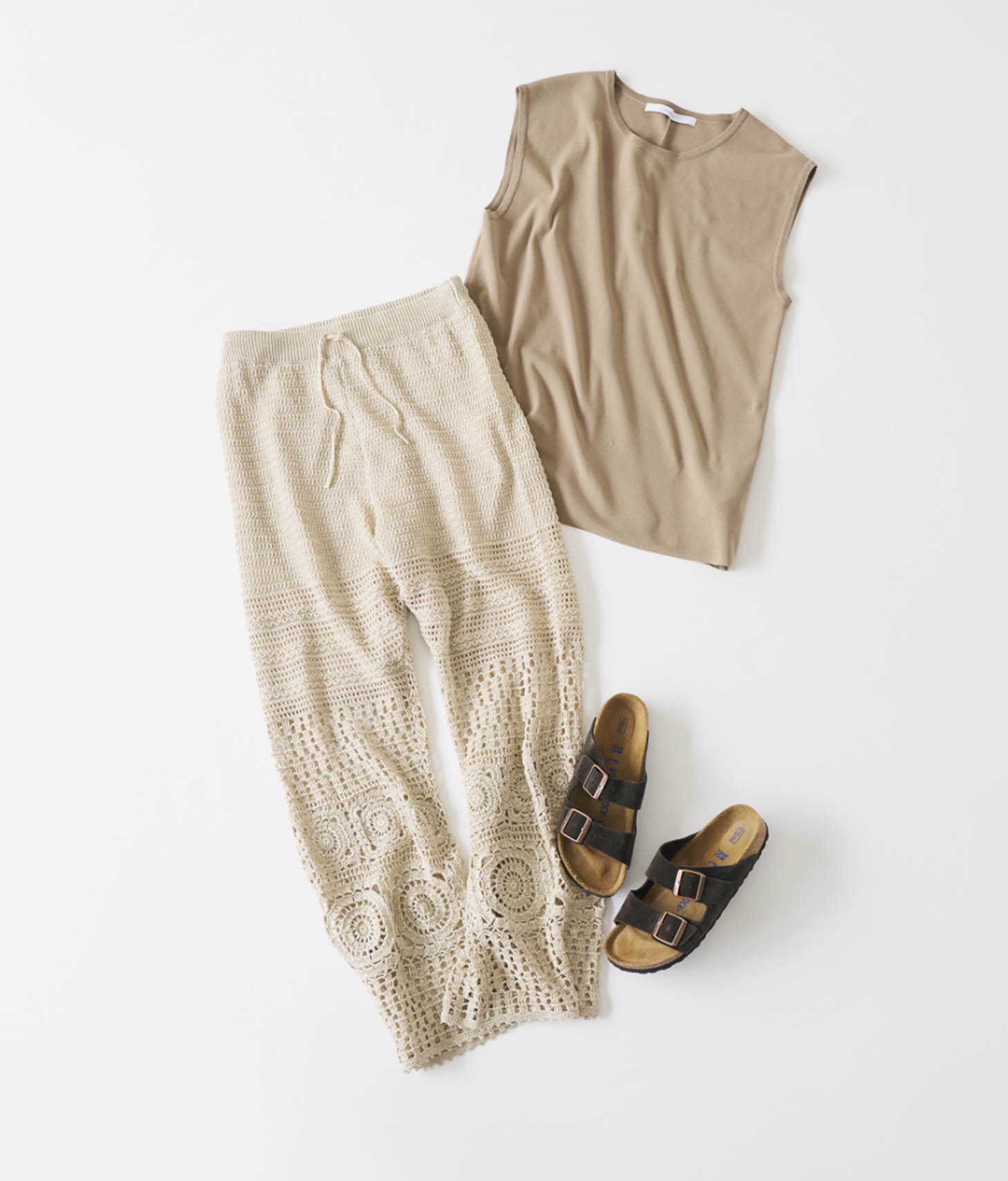 特徴のある糸を使用することで、クラフト感が和らぎ、シャープでカジュアルすぎないクロシェパンツに。軽い糸を使用することで、型崩れしにくく、デイリー使いし易いように工夫。カジュアル感が強いアイテムだからこそ“大人がデイリーに使いやすい“を追求し、大人カジュアル好きのこだわりがぎゅっと詰まったパンツ。