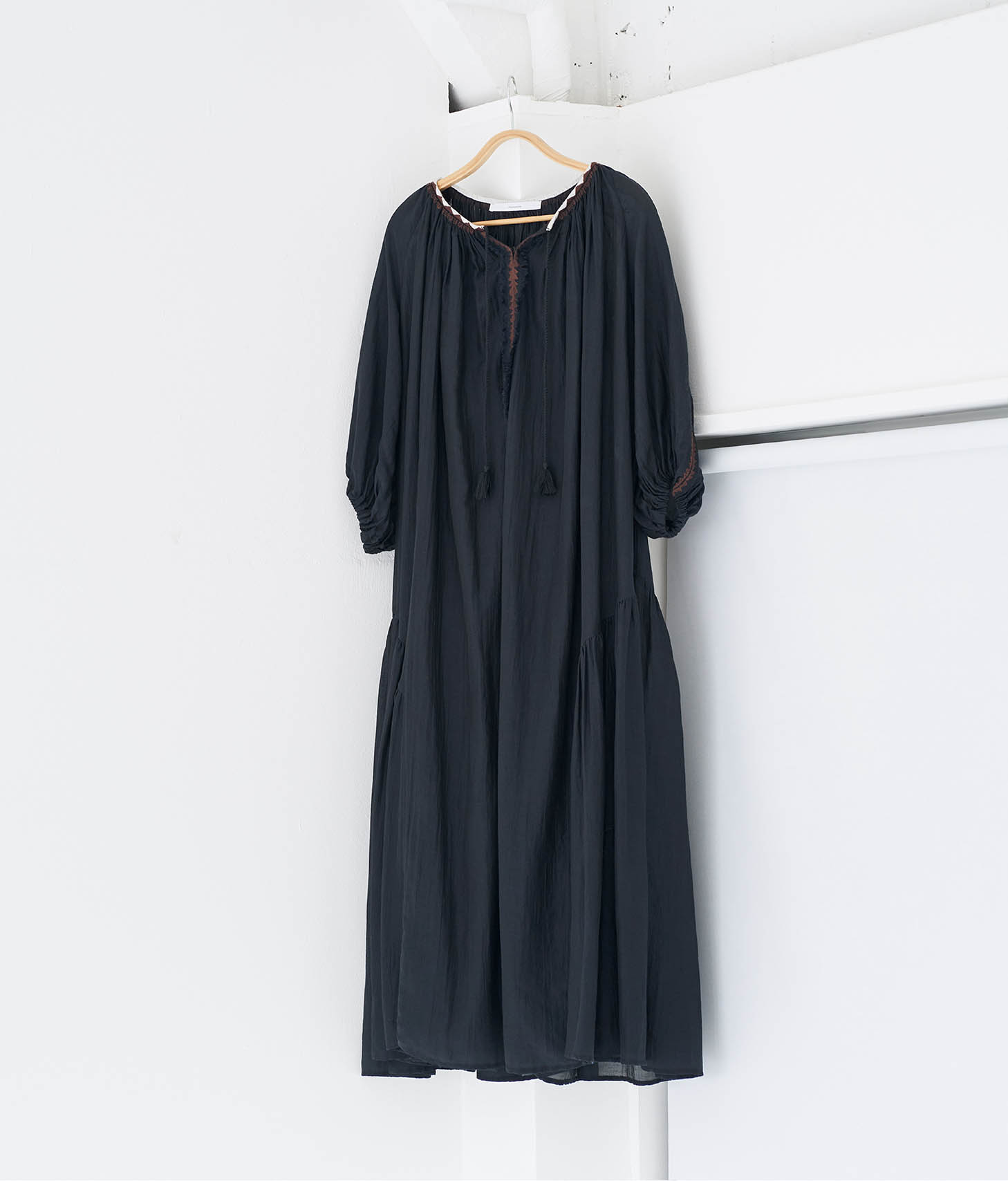 きめ細やかな綿とシルクを織り込んだ生地を使用することで、光沢感があり繊細で上品な印象のワンピースに。たっぷり入ったギャザーは柔らかい質感を引き立てながら、体のラインもカバーしてくれる大人に嬉しいデザイン。キャミワンピースのペチコート付きなので一枚でそのままお出かけも。旅行にはいけないけど、エスニックの刺繍が心躍る、着るだけでリゾート気分の味わえる一枚。