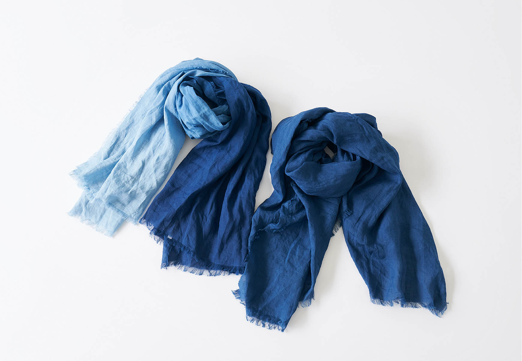 生地へのこだわりが魅力のブランド【THROW】のインディゴストールは超極細のラミー糸で織られているため薄くて軽く、首回りに巻いても全くストレスにならない一枚。天然の原料のみを使用し、日本屈指の技術を誇る藍染め工房で一点一点職人による手作業で染められたストールははずっと見ていたくなるような洗練された色合いが魅力。