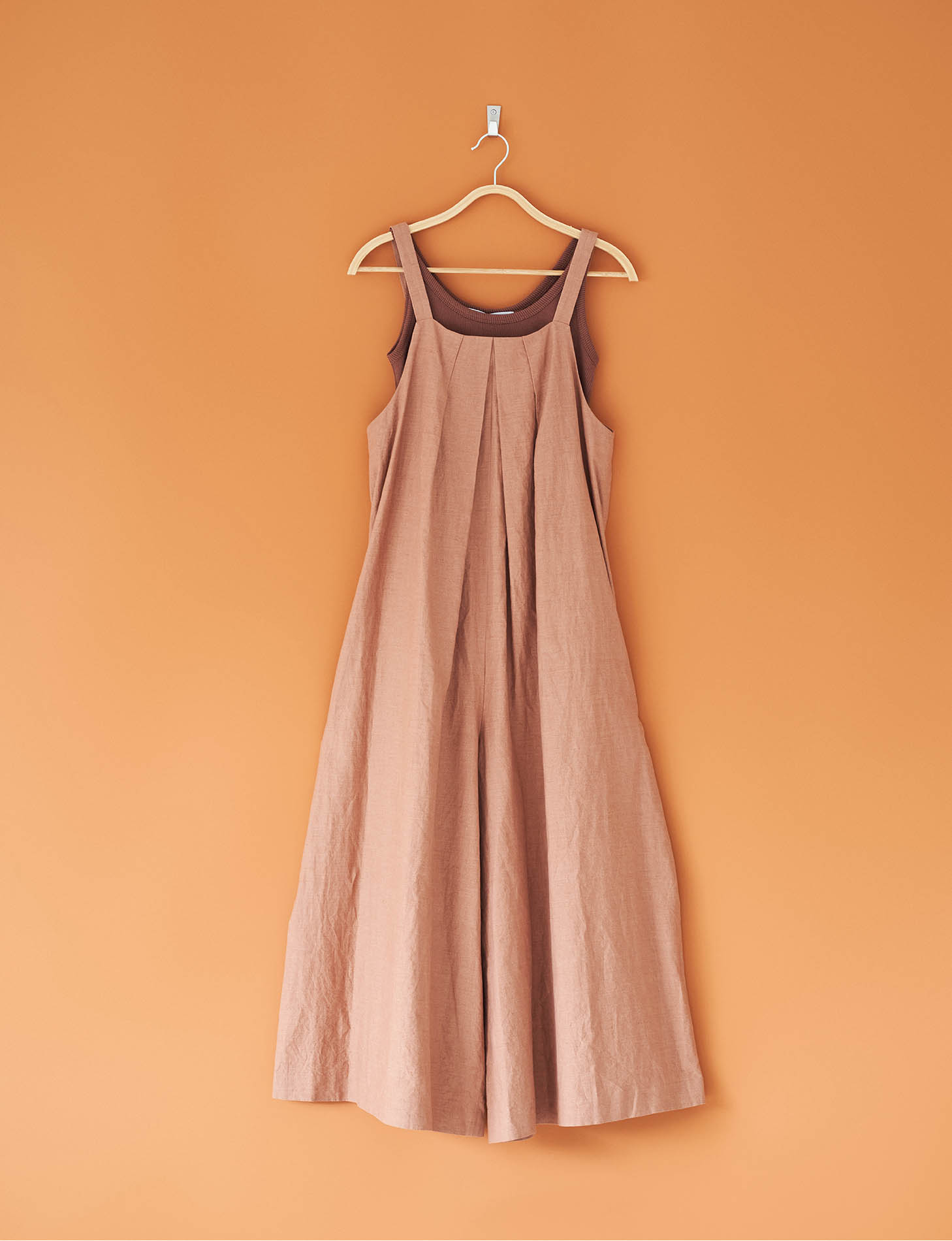 コットンリネンのヘリンボーン素材に水洗いを加えることで適度な膨らみとカジュアル感を出した大人が着れるオールインワン。裾にボリュームを持たせたシルエットで体のラインを気にせず涼しく着れる一着。