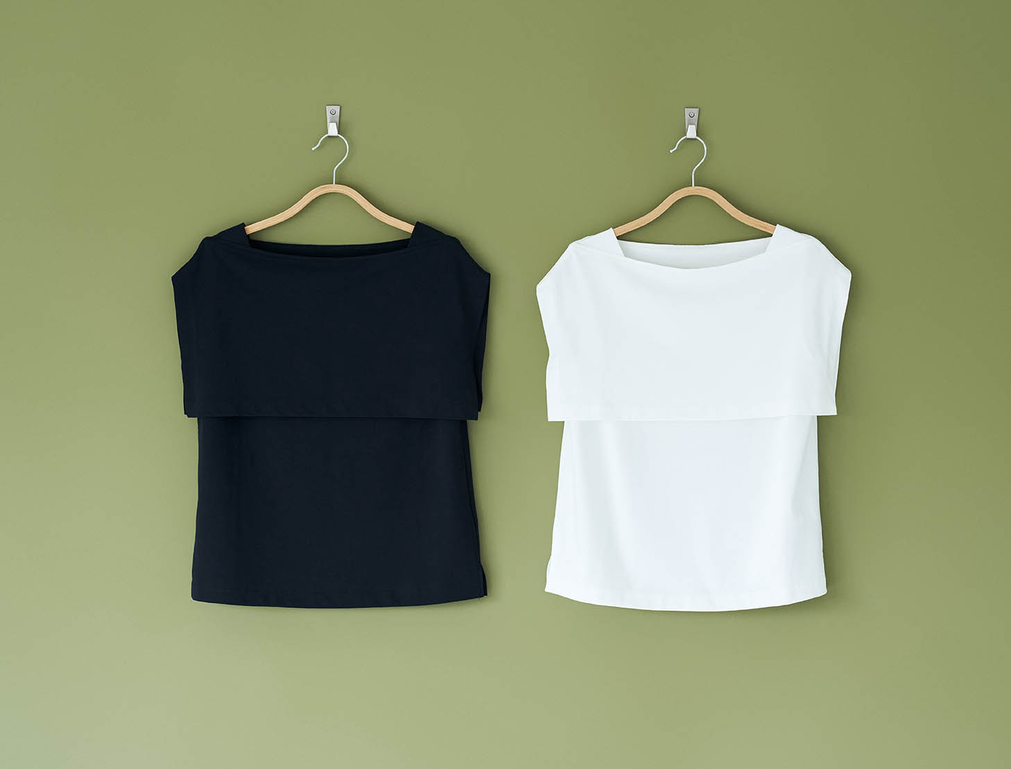 編み目が詰まったキレイな表面が特徴の天竺素材はシンプルでありながら存在感があり、一枚できちんと感のでるTシャツ。肩先が隠れるくらいの大きな襟のデザインがポイントで、ウエストをタックインした着こなしもおすすめ。