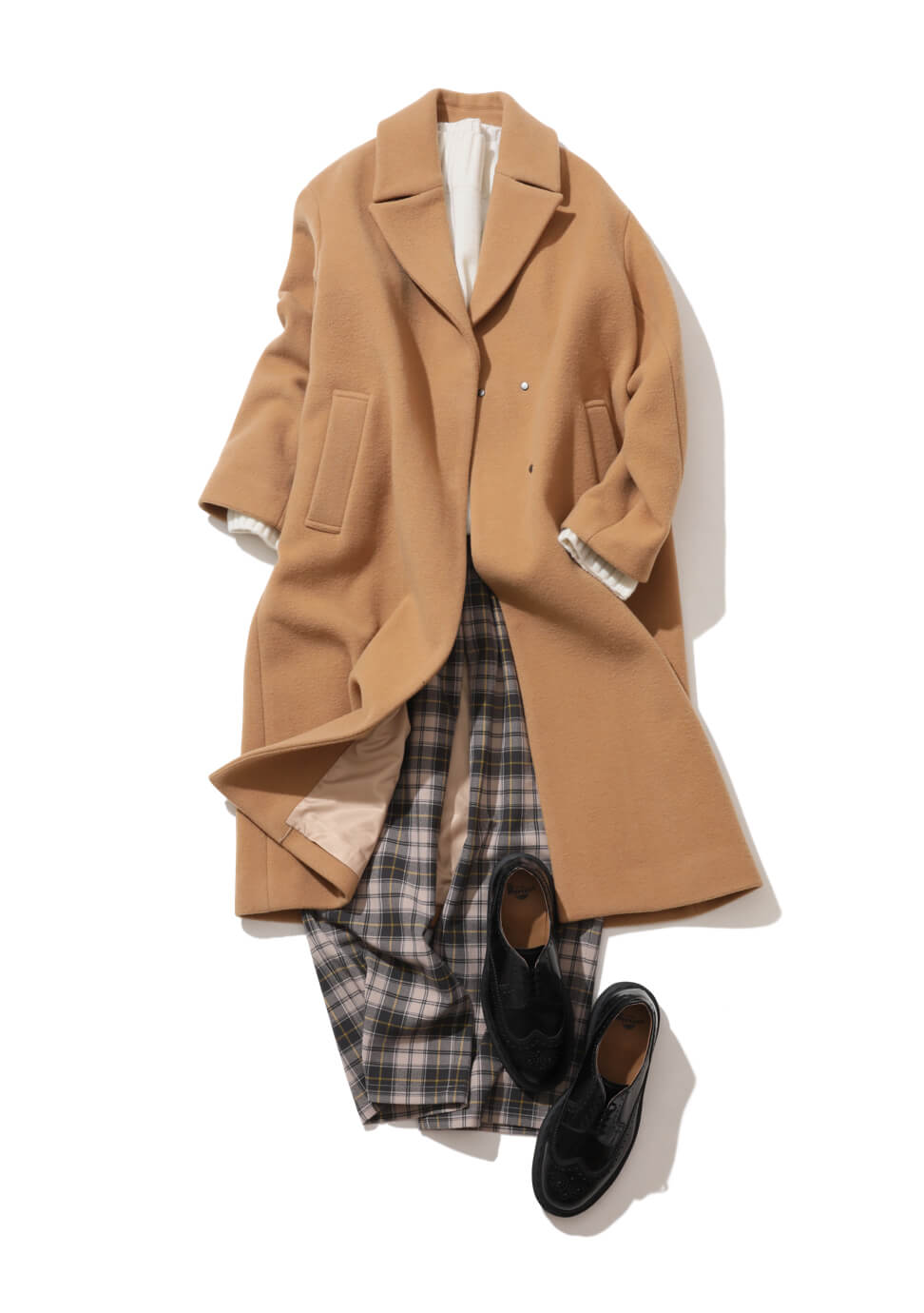 女性らしいコクーンシルエットとベージュの色味が肩肘張らずちょうどいい、ダブルブレストのコートからのぞかせたのは、チェックのイージーパンツ。トップスは品良く馴染ませる、優しげ白ニットが好相性。足元はドクターマーチンのドレスシューズを合わせて、やんちゃなブリティッシュボーイの遊び心をプラスして。