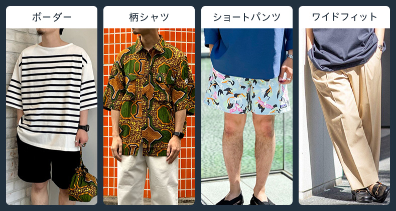 2021年夏のメンズのトレンドアイテムは、「ボーダー」「柄シャツ」「ショートパンツ」「ワイドフィット」。