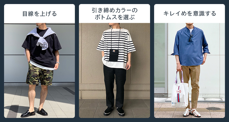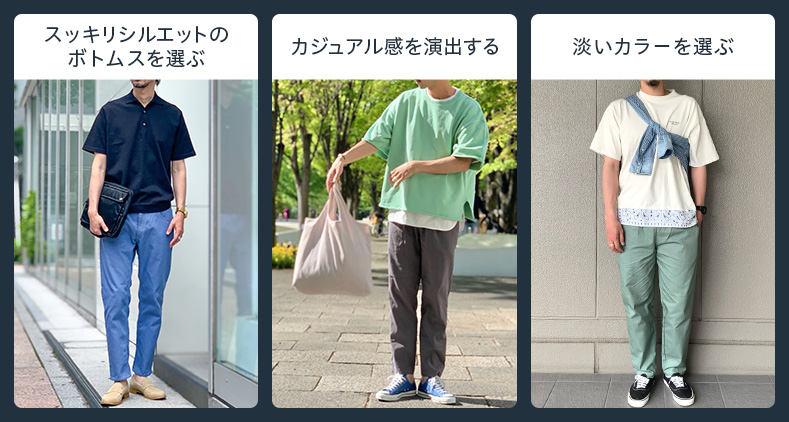 身長を高く見せたいと悩んでいる場合、「目線を上げる」「引き締めカラーのボトムスを選ぶ」「キレイめを意識する」の3点がポイントです。