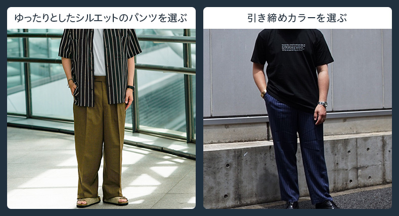 脚の太さが気になる方は、「ゆったりとしたシルエットのパンツを選ぶ」「引き締めカラーを選ぶ」のがポイント。