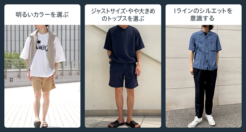 • シャツを肩掛けしたり、サングラスを首から掛けたりして目線を上に誘導すると、身長の低さが気になりにくくなります。