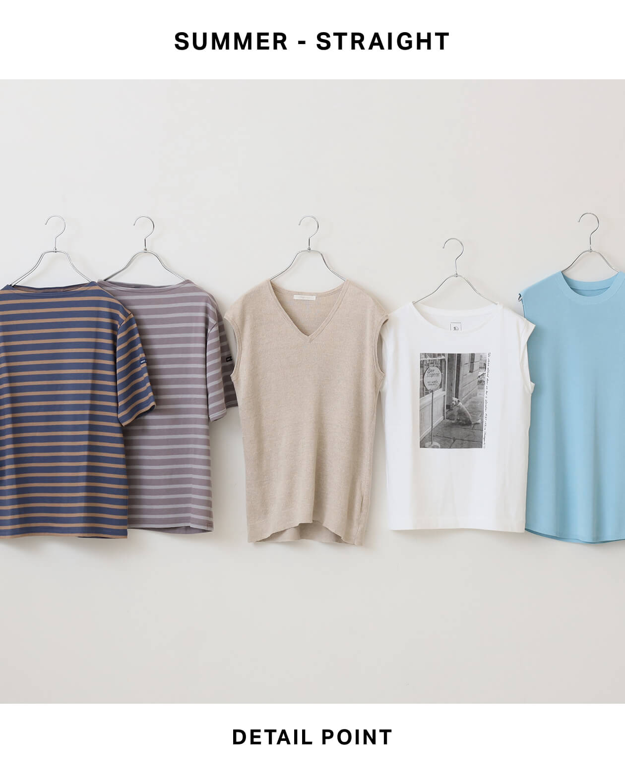 デザインがベーシックになりがちなストレートタイプは、色やポイントで遊びを加えたい。夏らしいブルーのトップスや、フォトプリントやボーダーでカジュアル感をプラス。Vネックニットは、ネックの絶妙な開き具合や二の腕をカバーするフレンチスリーブ風のアームラインなど、シンプルだからこそ計算されたディテールが光る一着。 - IENA【SAINT JAMES / セント ジェームス】別注 PIRIAC ◆¥8,030(税込)