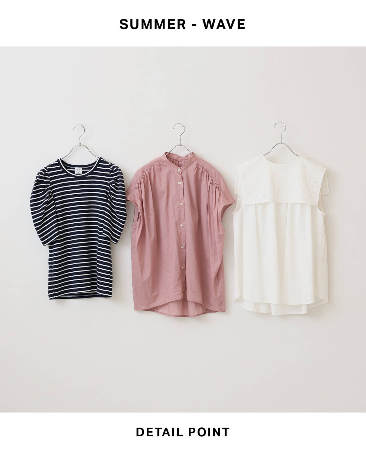 やわらかい質感が似合うウェーブタイプは、Tシャツよりもブラウスタイプがおすすめ。ピンクのブラウスは、肩にギャザーのワンポイントを効かせたコクーンシルエットが女性らしいデザイン。カットソーはギャザーをたっぷり寄せた袖コンシャスなデザインなど、デコラティブなものをセレクト。 - U by SPICK&SPANハーフスリーブギャザーボーダー2◆¥8,800(税込)