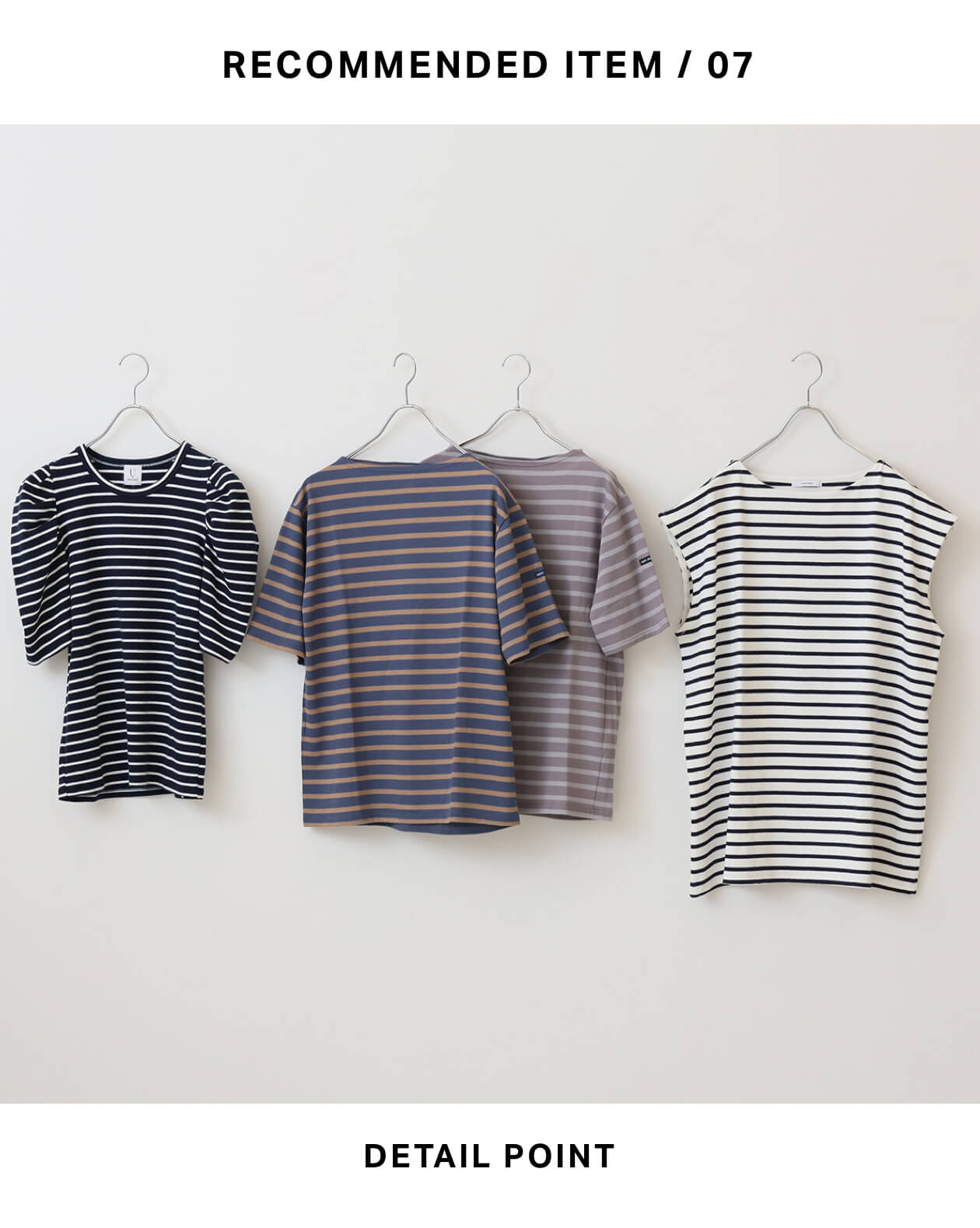 - カジュアルなボーダーTシャツはモノトーンのはっきりしたものではなく、コントラストの弱いものがおすすめ。グレーの混じった色味がニュアンスを醸し出します。袖コンシャスなタイトデザインはボトムスにタックイン、1枚でサマ見えするゆるめのシルエットはさらりとアウトして、飾らない大人コーデを簡単にメイク。