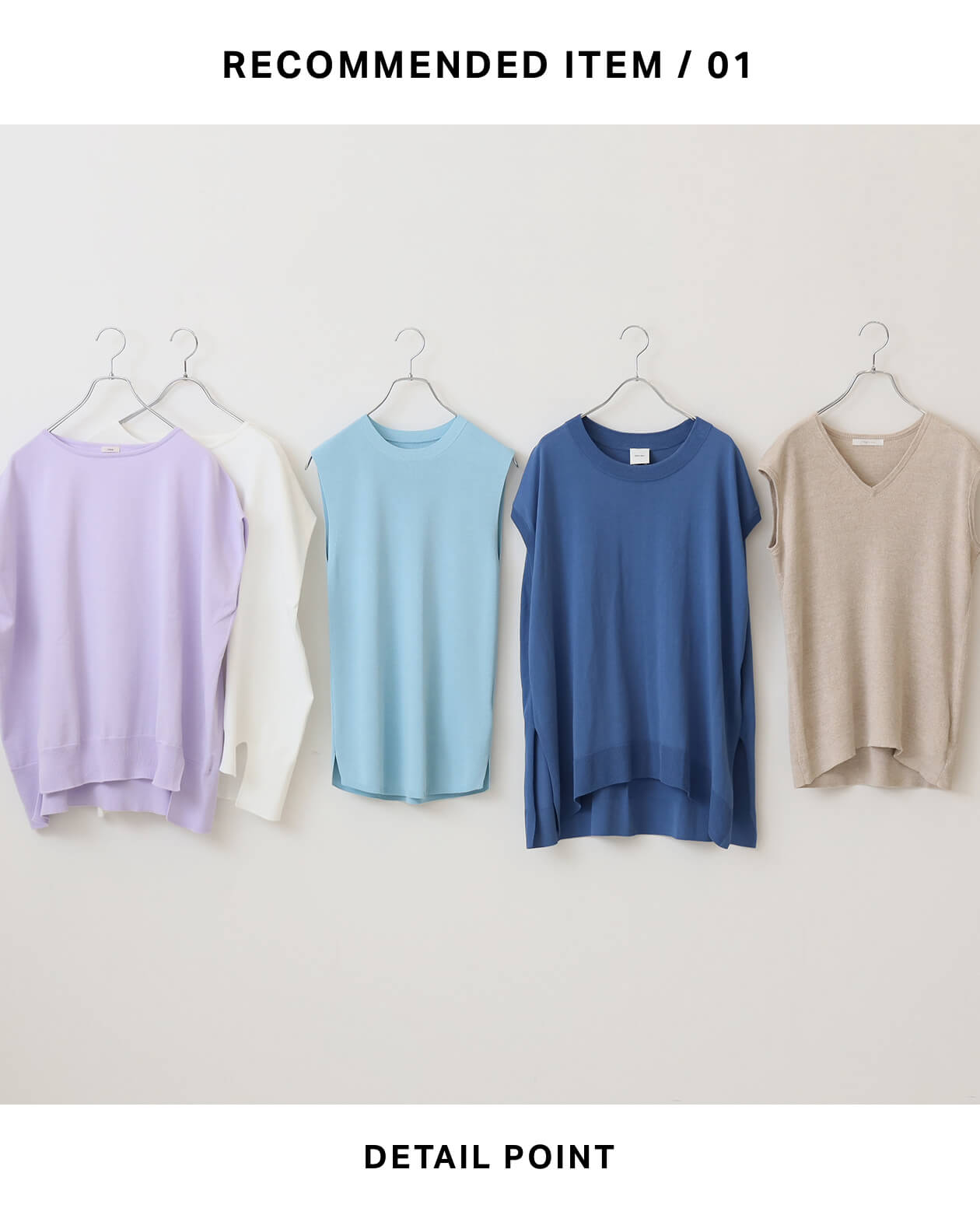 - サマータイプの中でも初夏を感じるようなパステルカラーのラインナップ。トレンドのサックスブルーのノースリーブニットは、好印象をゲットできる着映えアイテム!明るいカラーは白との相性がいいので、ホワイトボトムスを合わせてさらに爽やかさを上乗せして。