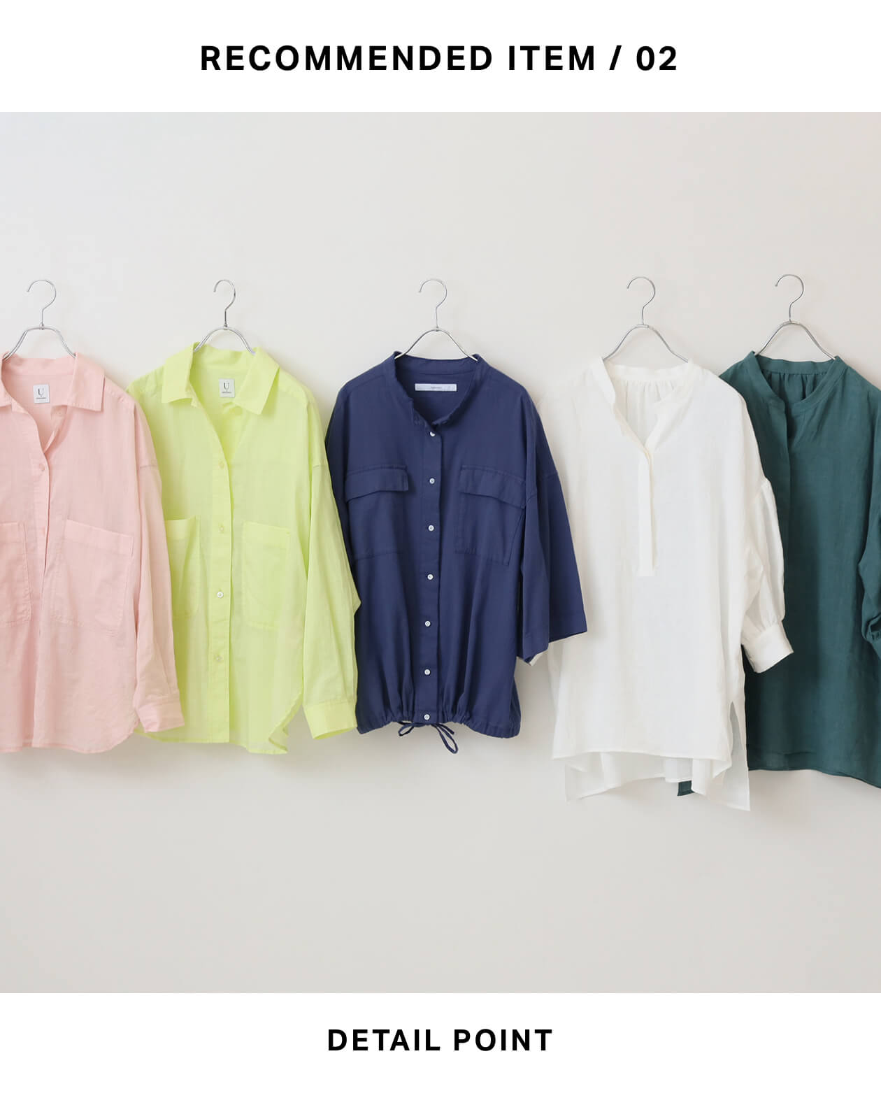 - 羽織りとしても使えるシャツは、彩りをプラスできる明るめカラーを。中でもブルーベース向きのイエロー見えするグリーンは、見極めが必要な希少カラーなのでぜひチェックして。袖コンシャスな今時ブラウスも、ドライなリネンなら落ち着いた印象をキープ。