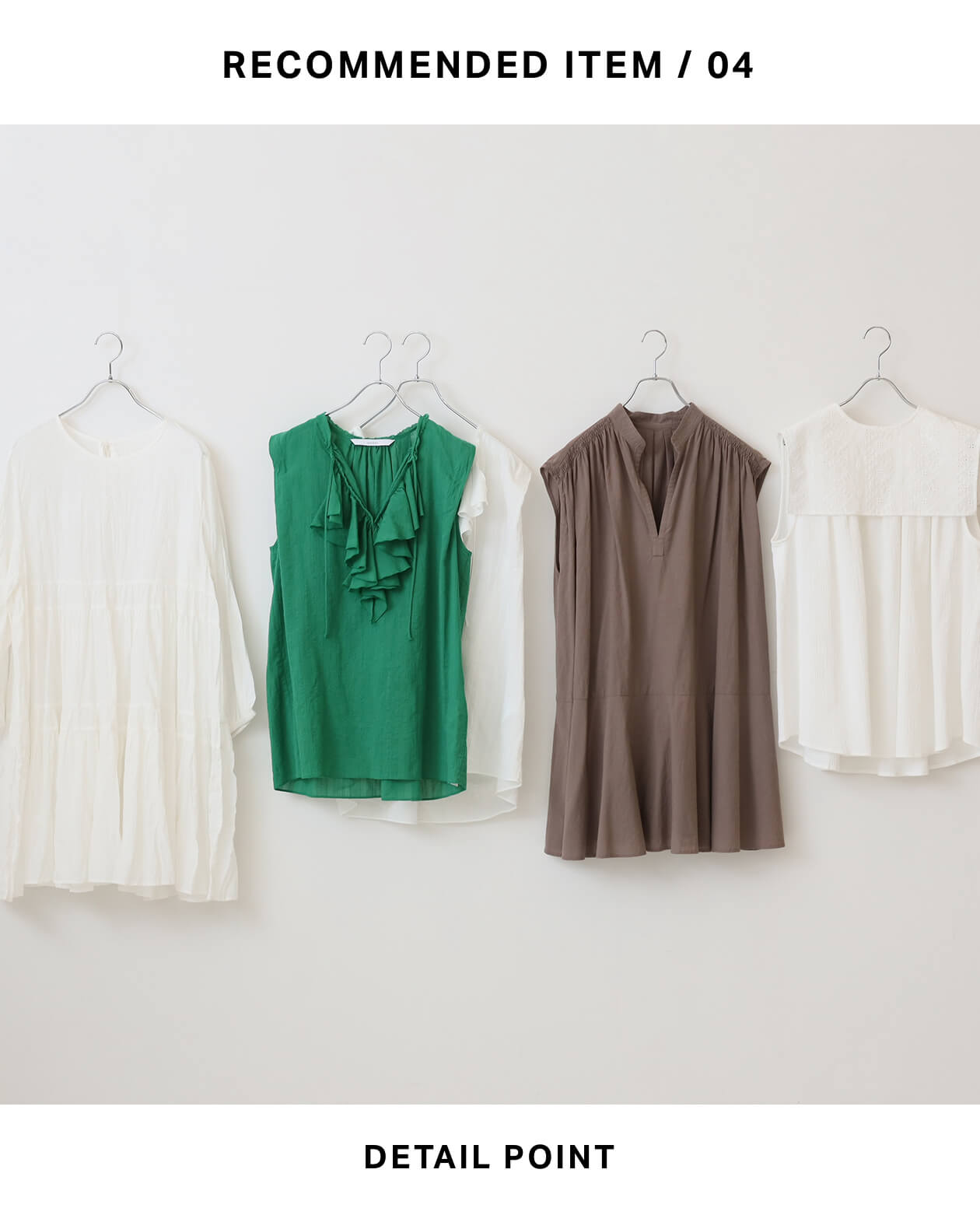 - 軽さのあるチュニックはクリーンなホワイトが好相性。前後どちらでもまとえる2WAY仕様のブラウスは、気分に合わせて着こなしを変えてみて。ラッフルカラーなどの華やかなデザインは青みのグリーンで落ち着かせて、洗練された印象に更新を。