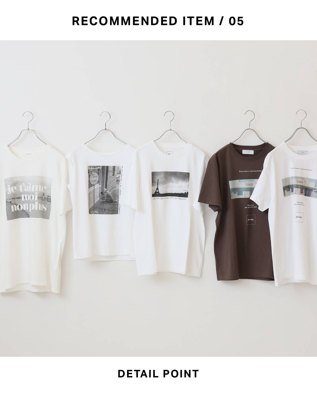 - 夏に着たいフォトプリントTは、モノトーンでもはっきりしすぎない色を選んで。ニュアンスのあるオフホワイトやブラウンに近いニュアンシーなダークグレーの色味が、サマータイプにも似合うやわらかさを演出してくれます。かすんだ色合いのフォトプリントなら、こなれ感もたっぷり。